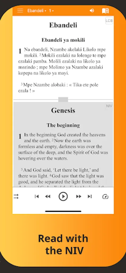Biblica New International Version in English that can be read side-by-side or verse-by-verse with the Lingala Translation.