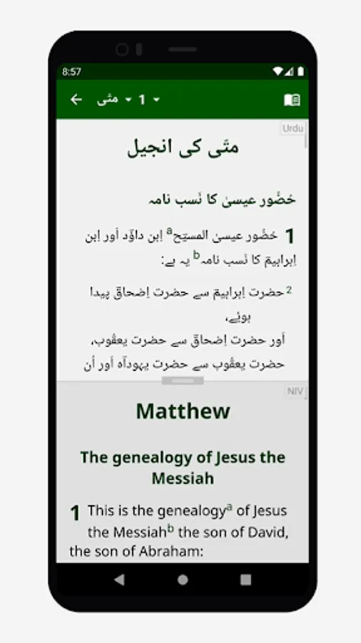 انگریزی میں Biblica کا نیا بین الاقوامی ورژن جسے ساتھ ساتھ یا آیت بہ آیت پڑھا جا سکتا ہے۔