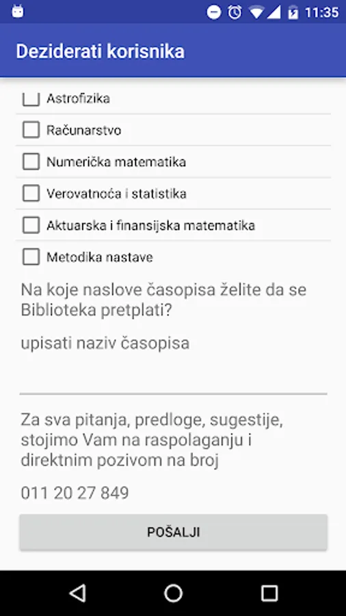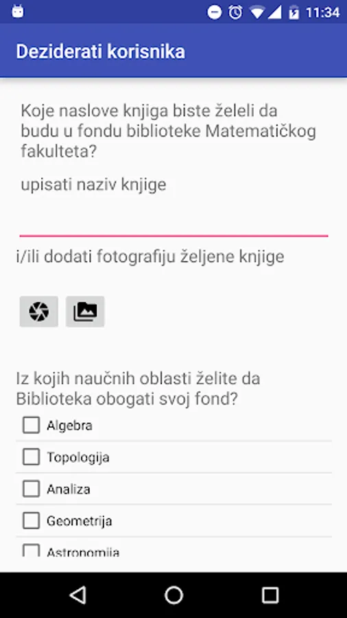 Aplikacija je napravljena sa ciljem da pruži bibliotekarima Matematičkog fakulteta uvid u potrebe i stavove svojih korisnika o bibliotečkoj građi koju bi korisnici želeli da imaju u fondu svoje Biblioteke.