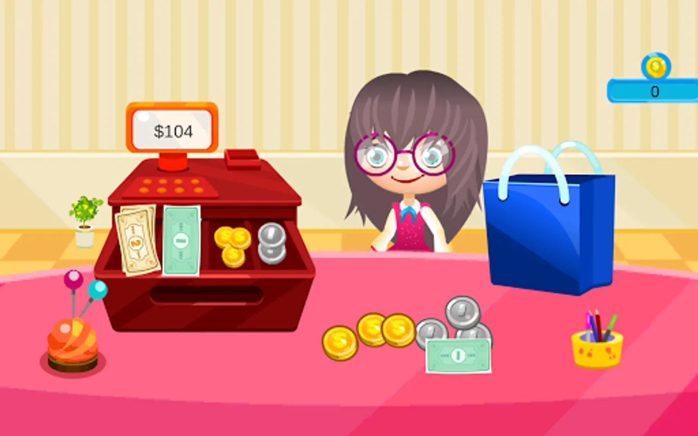 In this scene player needs to drag the currencies and coins to the box separately and once the amount is counted a bill is generated by the billing machine & cash register. Drag the bill towards the packet and then to the customer to get it delivered.