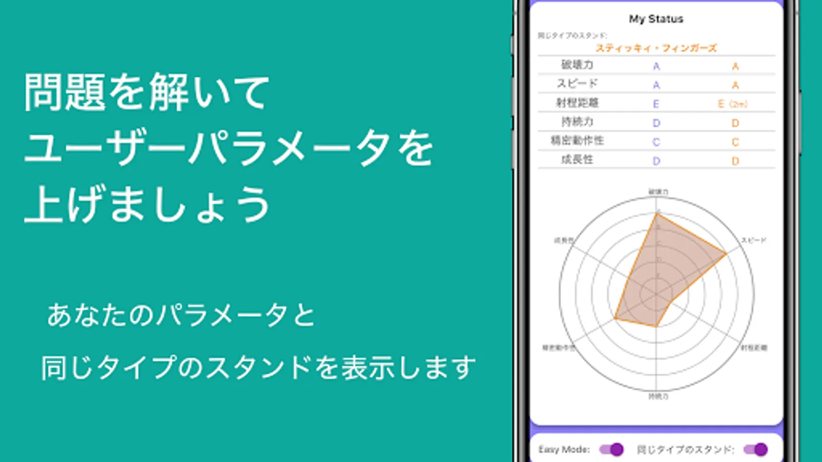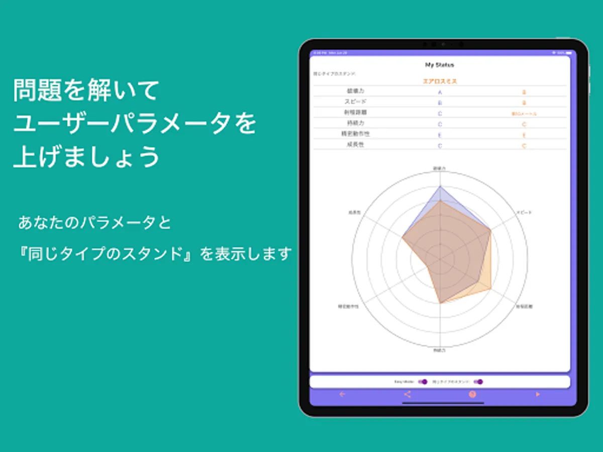 「スタンドクイズ」は漫画『ジョジョの奇妙な冒険』のスタンドに関するクイズアプリです。パラメータが表とグラフで表示されるので、合致するスタンドを選んでください。