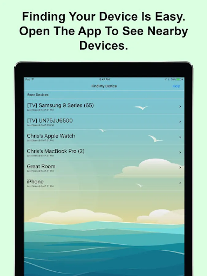 • Walk around slowly until you see your device's name displayed. This indicates that your device is near by.