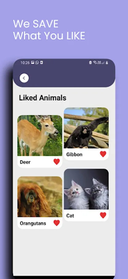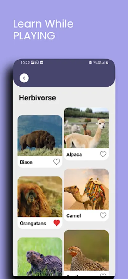 Children can play the game and learn the animals sounds and animal names quickly... like in few days. Also you can short list you favorite animals using like option ( heart icon ).
