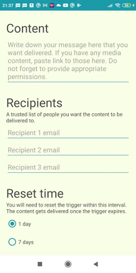 The app will notify you from time to time to reset your trigger. You are free to choose the duration of the trigger. If something does happen to you and the switch is not reset, your secure message will be sent.