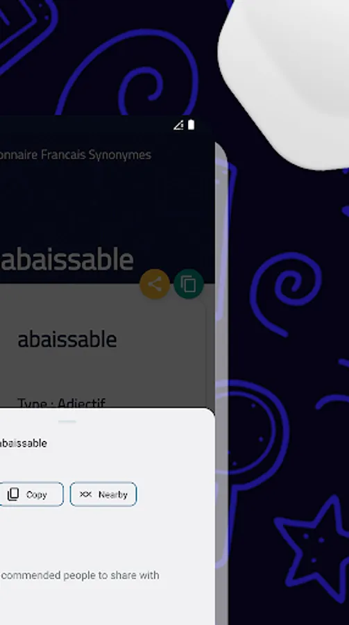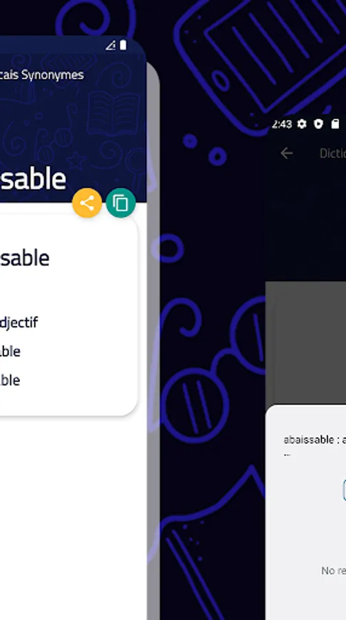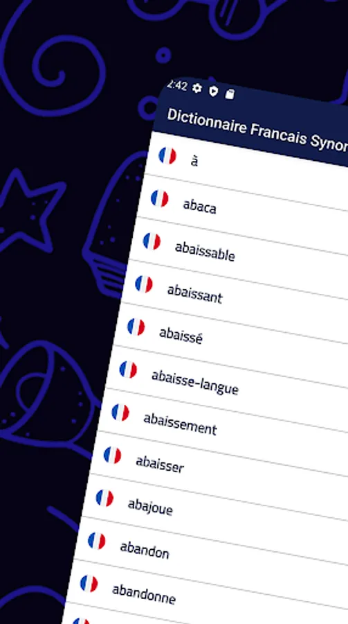 This application offers more than 52,000 French terms and synonyms, finding the definition you are looking for is simple, type your term and you get the synonym for your word in French language, a list of favorites is also available for the words often consulted as well as the your search history.