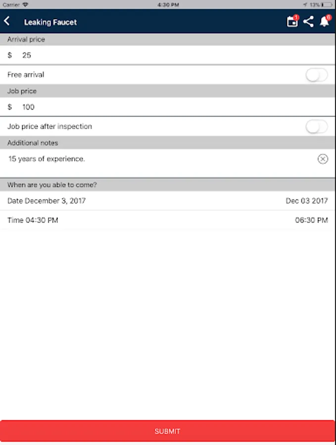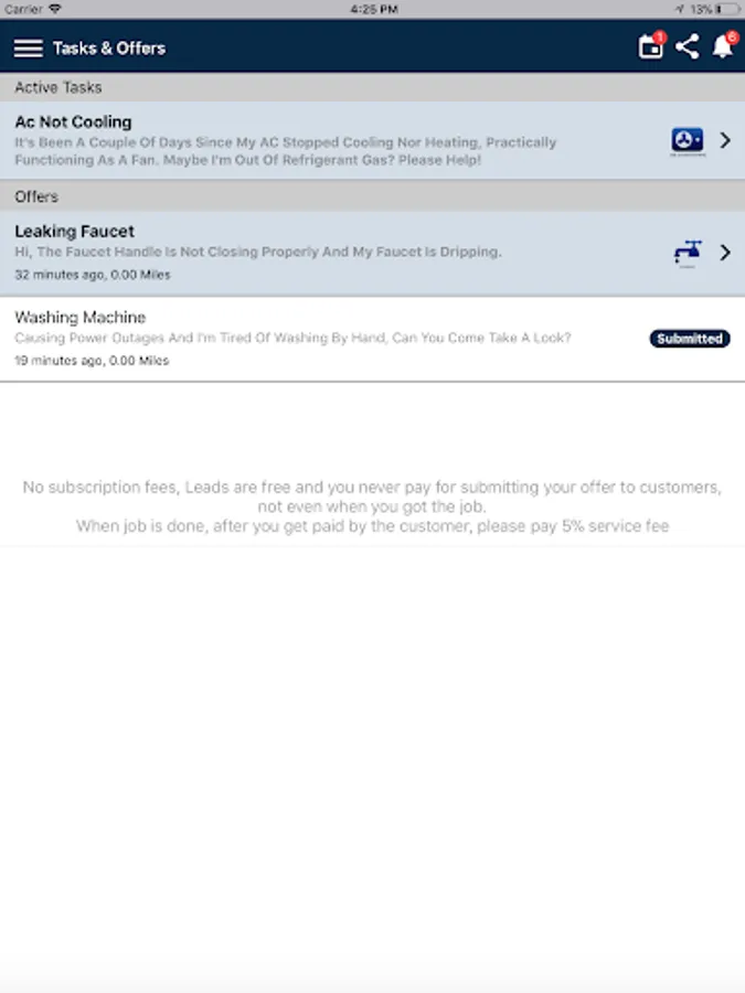 Local vendors get push notifications instantly alerting about new requests and jobs. You can easily view job details, photo, etc. On your mobile, you can provide a price quote, arrival time and communicate with the customer instantly.