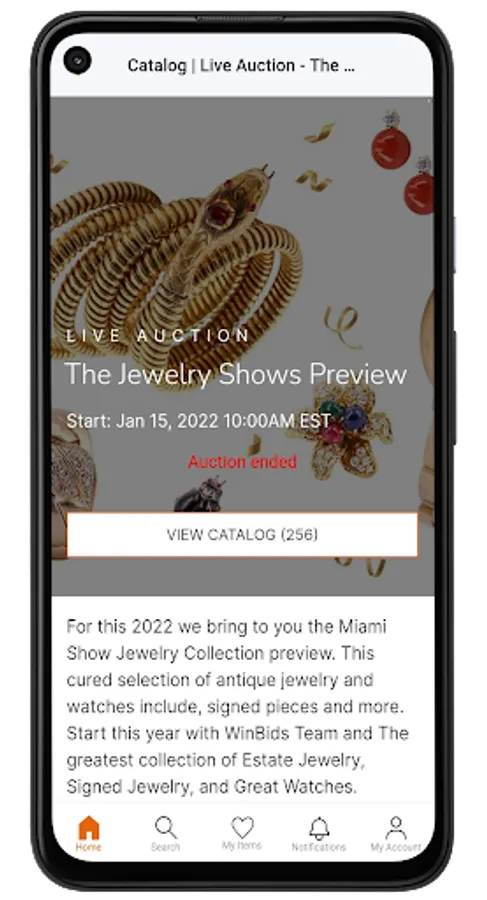 WinBids conducts approximately several auction sales per year of fine art, fine and estate jewelry, silver, furniture, fashion design and more. We also feature specialty jewelry and gift auctions in special occasion sales such as holidays. The catalog for each is posted approximately two weeks prior to the auction date. To receive email notices of up-coming auctions please sign up to the WinBids mailing list.