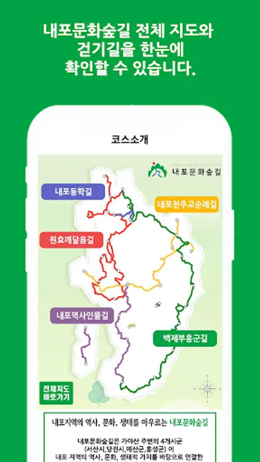 The Naepo Culture Forest Trail is a long-distance walking tour that connects 4 cities and counties (Seosan, Dangjin, Hongseon, and Yesan) around Mt. Gaya based on the history, culture, and ecological values of the Naepo area. The total distance is about 320km.