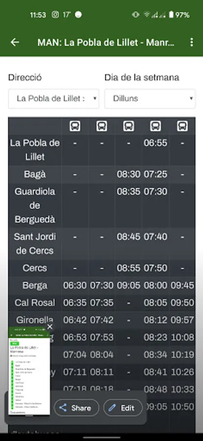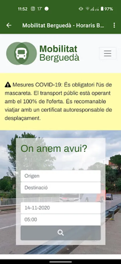 The new Berguedà Mobility application informs you of the bus schedules that connect Berguedà, Barcelona, Manresa and other towns. Choose your departure and arrival town and you will see the different buses with their timetable and route.