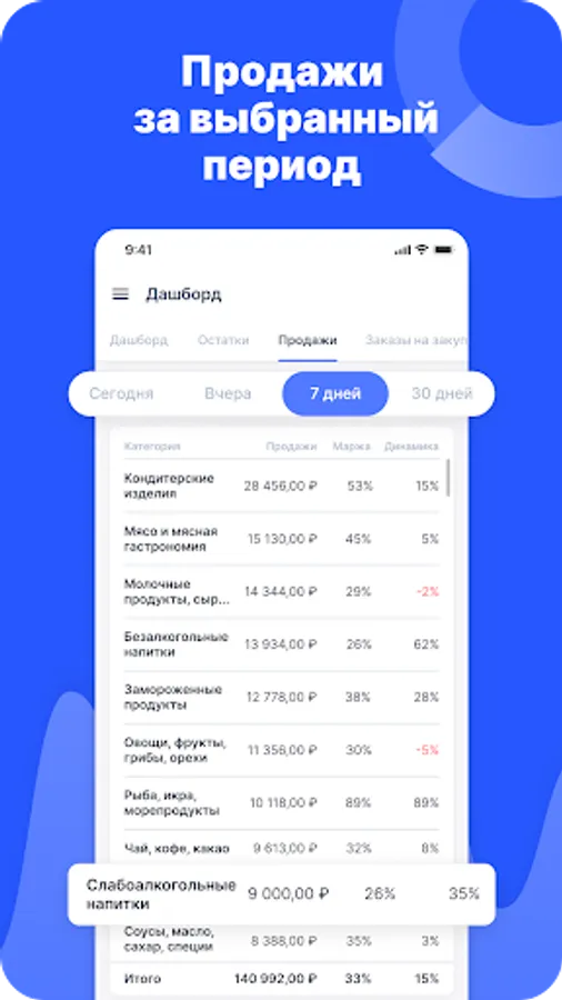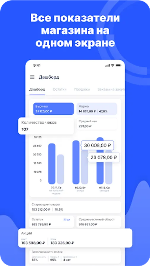 Mobile application for the owner and commercial director of a retail store. Designed to receive operational information about the status of a retail store or network connected to the Mera.biz service