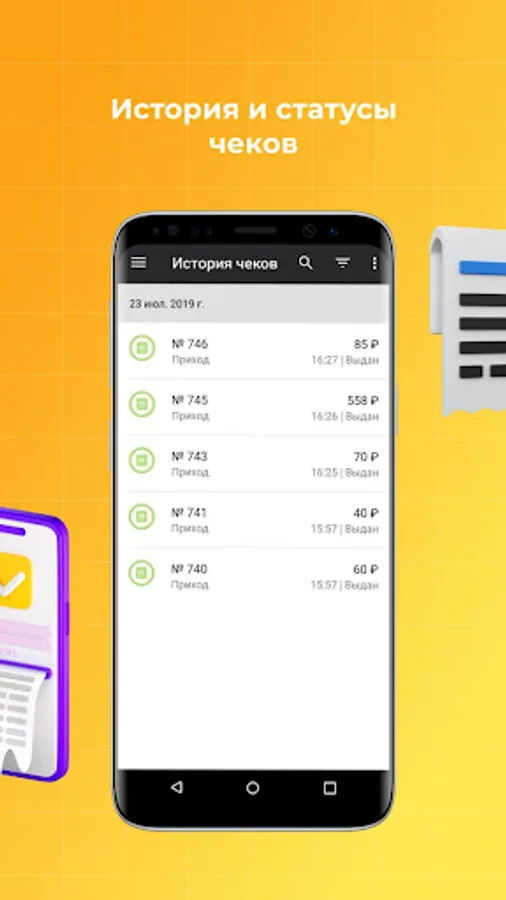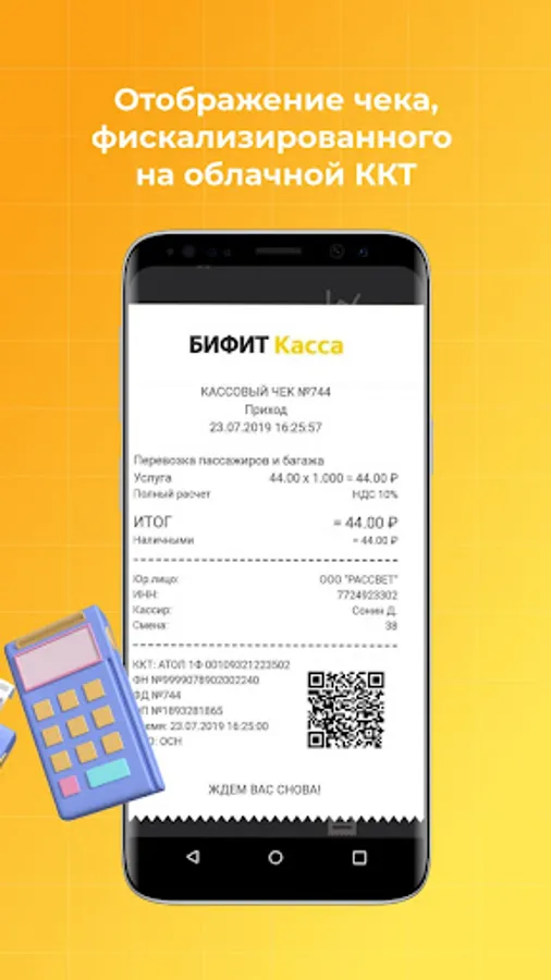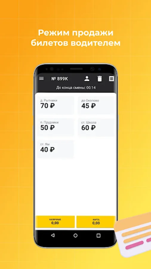 Install the Kassa Transport application on smartphones, tablets or drivers' cash desks to accept payments, generate checks and comply with 54-FZ.