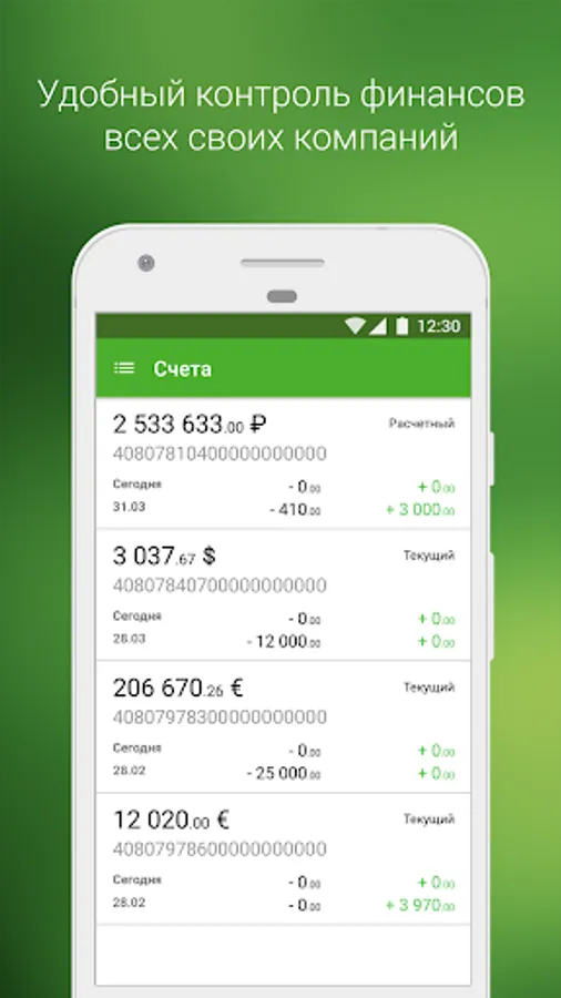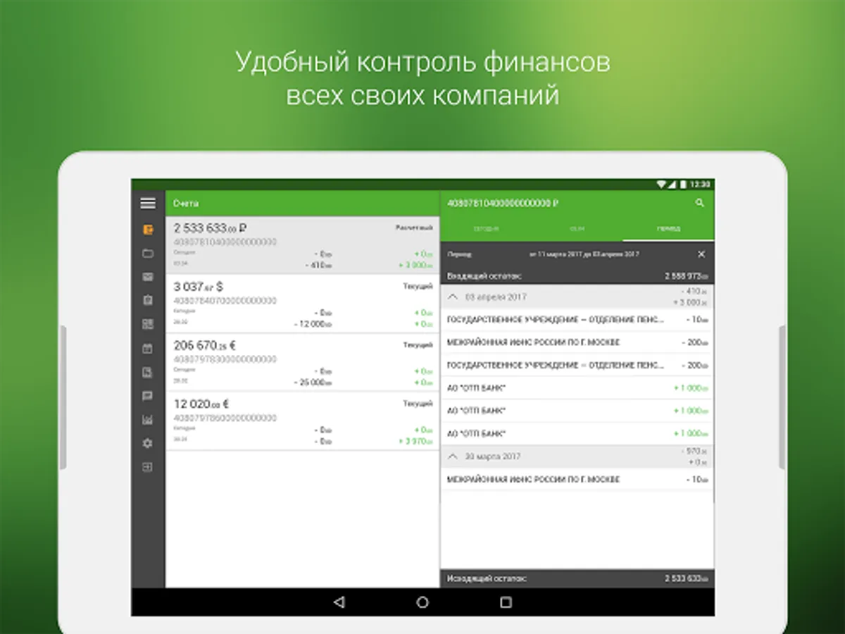 • view information on all accounts: ruble and foreign currency accounts, current balances, statements for the period and in real time.