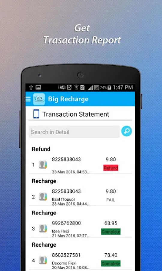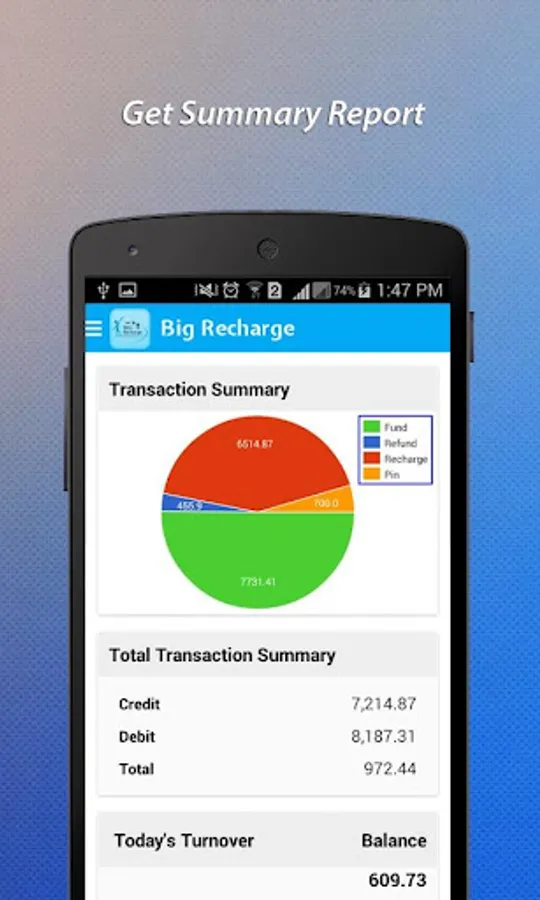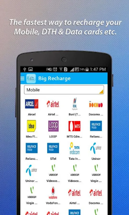 A beautiful yet powerful android application for one sim recharge services. Big Recharge provide online recharge and sms based recharge services based on selected mode. An e wallet based mobile recharge application for easy recharge service.