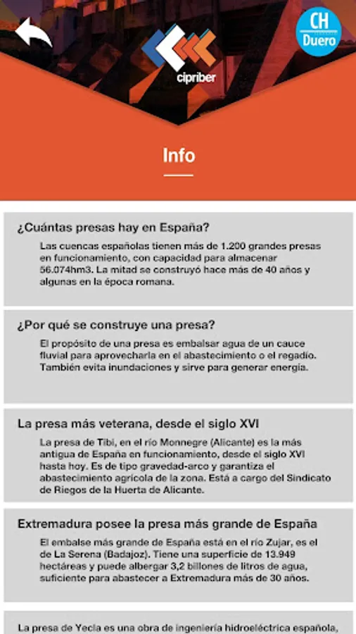 Official App of the Life Cipriber project, under the Duero Hydrographic Confederation, which reports on the demolition process of the old Yecla de Yeltes dam, as well as an Augmented Reality viewer so that the user can know this infrastructure on site.