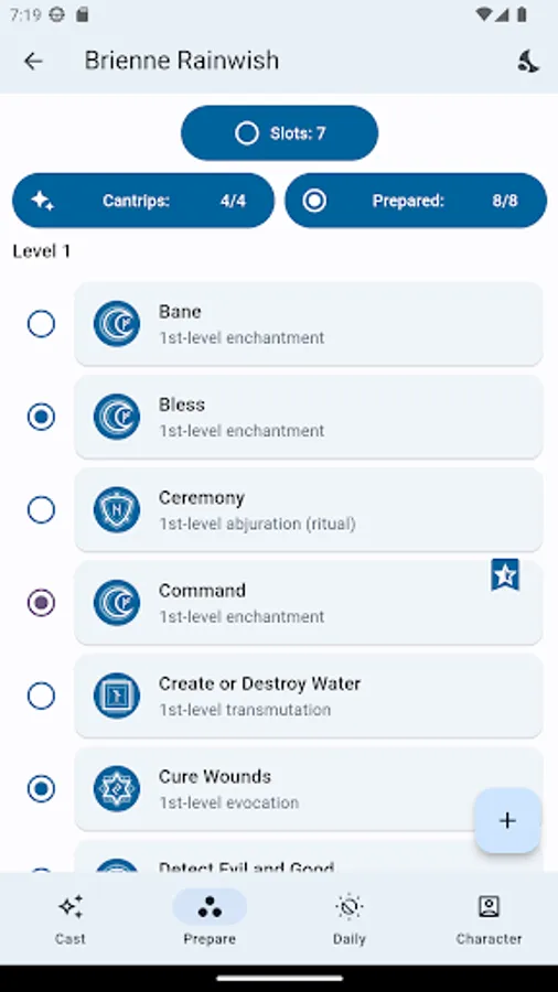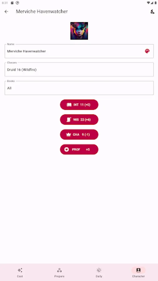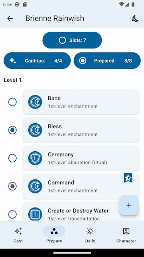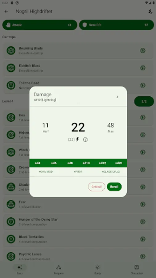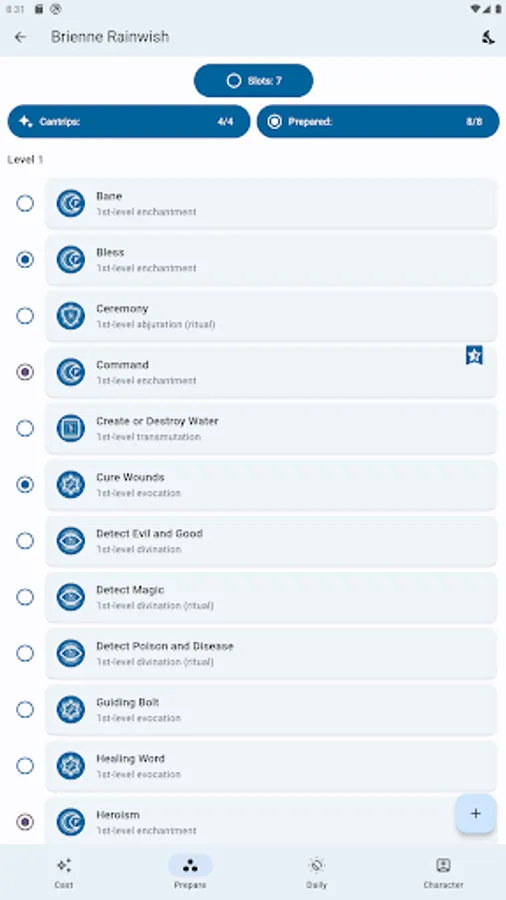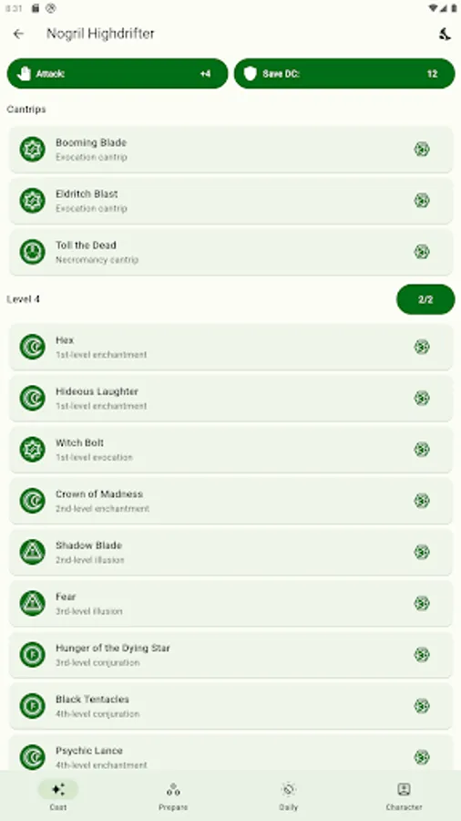 *MANAGING SPELLS: All the necessary spells from your classes and subclasses are automatically added, and the rest you can add and manage yourself in the 'Prepare' tab.