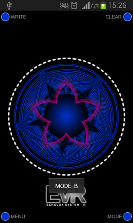 "WRITE" (MODE B ONLY) - When write is enabled the dashed circle on the screen will begin to pulse indicatiting that the app is now "sampling" the microphone input. When disabled the audio will then be played back chopped to 250ms to 1500ms, reversed and in random burst of multiple sounds depending on compass reading. (see mode B instructions)