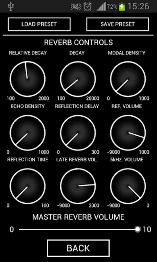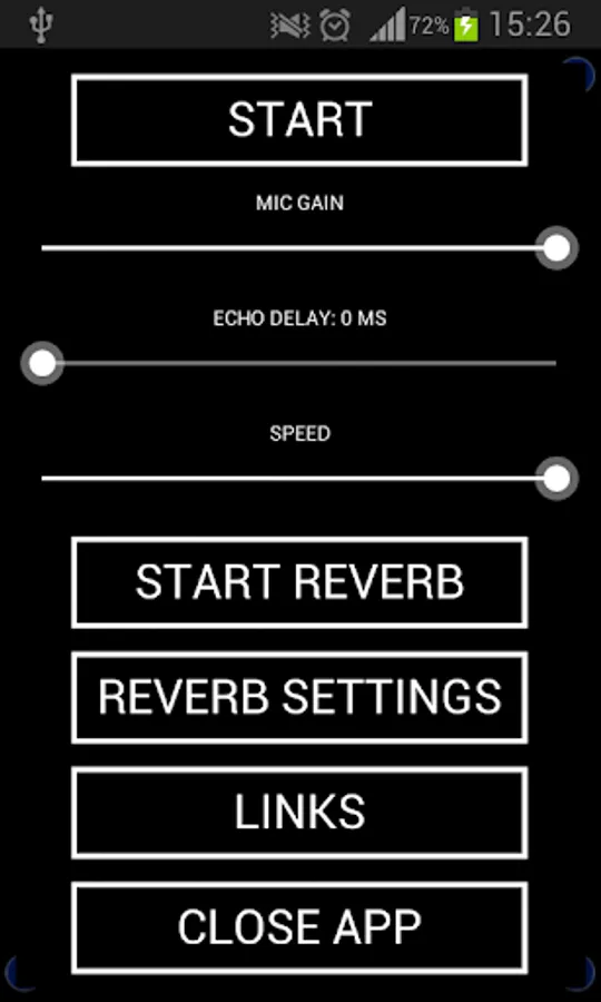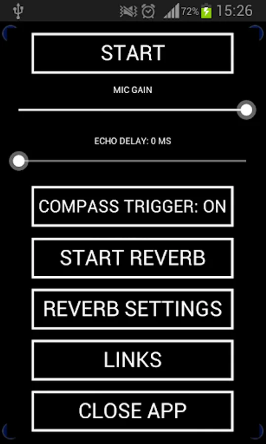 "MENU" - opens app settings. Set delay time, reverb, speed, mic gain and access compass toggle etc. Start there.