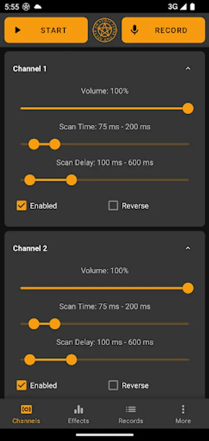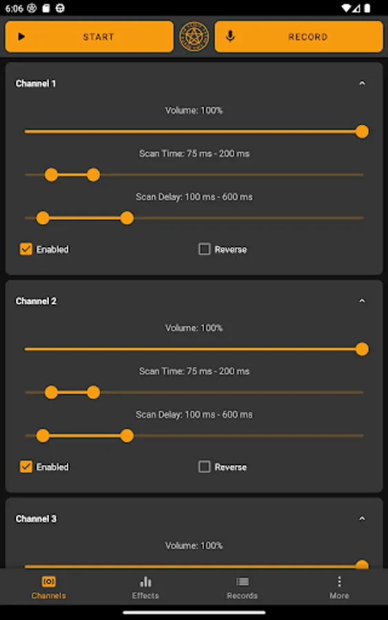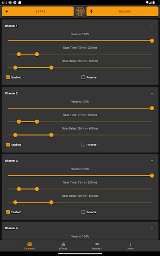 A whole new audio engine scans 4 sound channels to precise scan settings you control. Each channel can be played back forward or backwards or turned on or off.