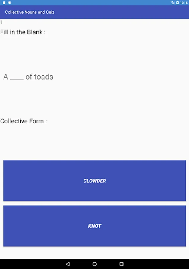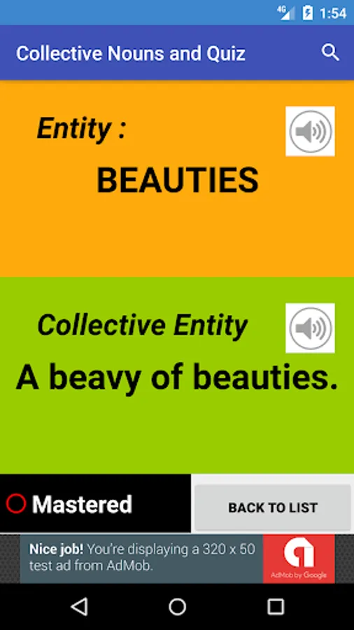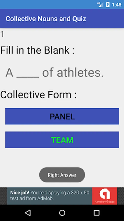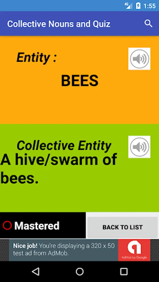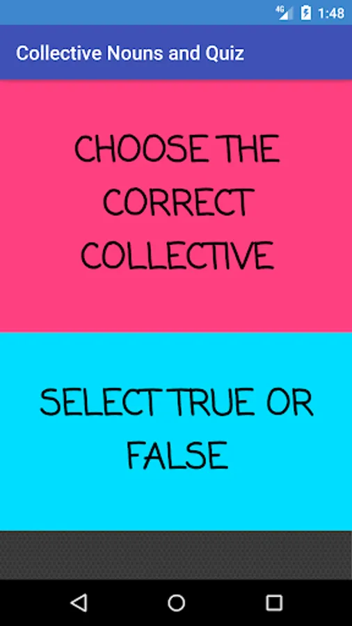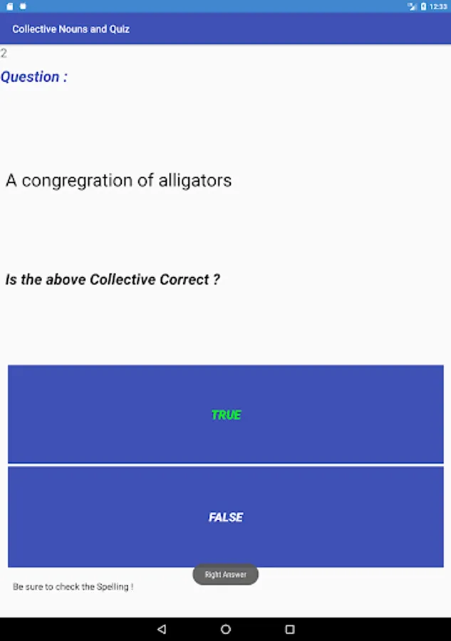 There is a quiz segment that has both multiple choice questions and a true-false segment to test proper spelling and knowledge of collective nouns. The quiz comes in sets of 20 randomized section at the end of the test for better understanding and rectifying mistakes.