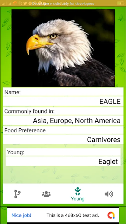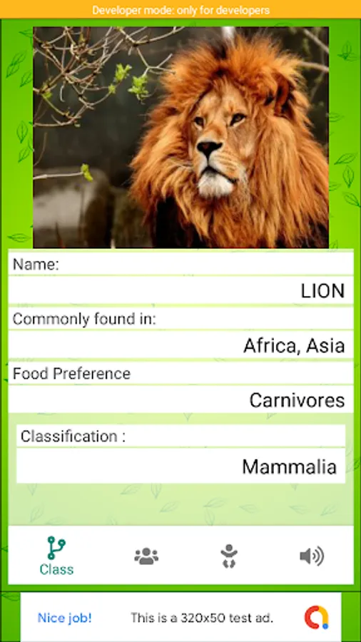 In this application you will find the names of over 100 animals along with their photos, locations where they are commonly found, their food habits (herbivores/carnivores/omnivores etc), their collective nouns (a pride pf lions, a troop of monkeys) , and names of their young (eg - The young of Lion is called Cub and the young of Dog is called Puppy).