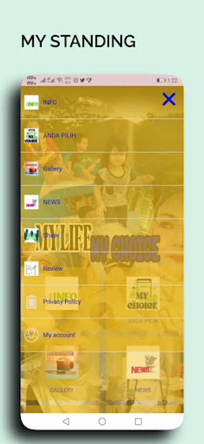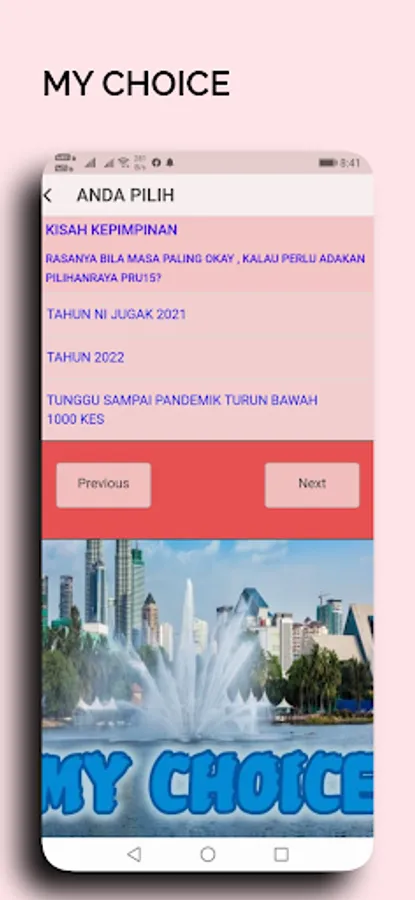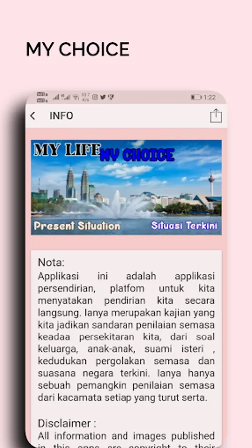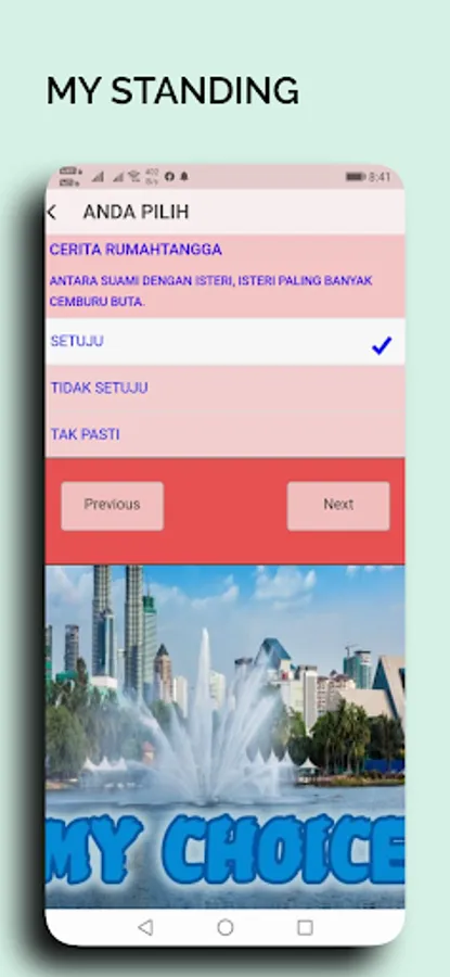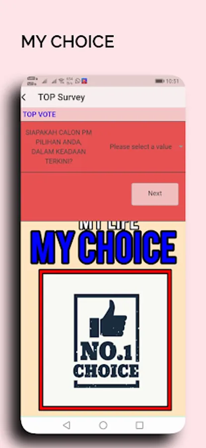 Applikasi MY CHOICE ini , membuka ruang untuk kita menyatakan pendirian kita secara berkelompok, tanpa mendedahkan siapa diri kita secara peribadi. Setiap persoalan akan kita tangani dengan jawapan yang datangnya dari pilihan kita sendiri.
