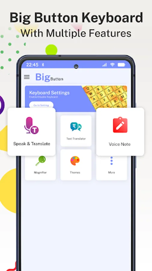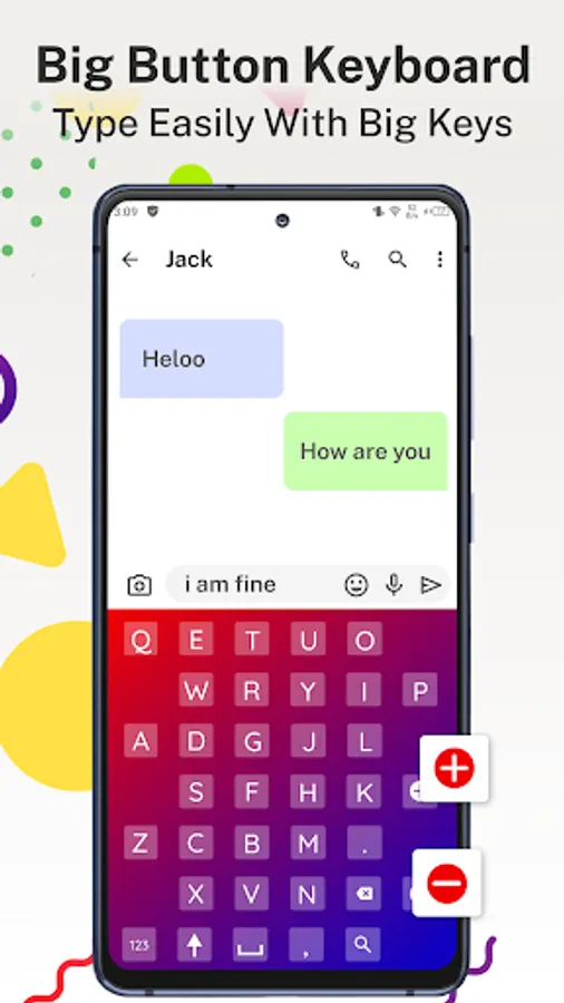 Big button keyboard- Big keys typing App is made for those people who want big keyboard with fat keys. Big Button Keypad & Voice Typing application provides you ease of typing words. Big button keyboard has bigger number and Punctuation buttons that will make typing correct & easier. this keyboard has big buttons but It has the same display as normal keyboards. Big Button keyboard will make typing simple for you with its larger buttons than the normal keyboard so it's easier to type even on small screens or with large or fat fingers. You can also increase or decrease your phone keyboard keys text size simply. Keyboard themes will make your phone device look stylish. The big keys keyboard is a stunning keyboard app with simple and easy user-friendly interface.