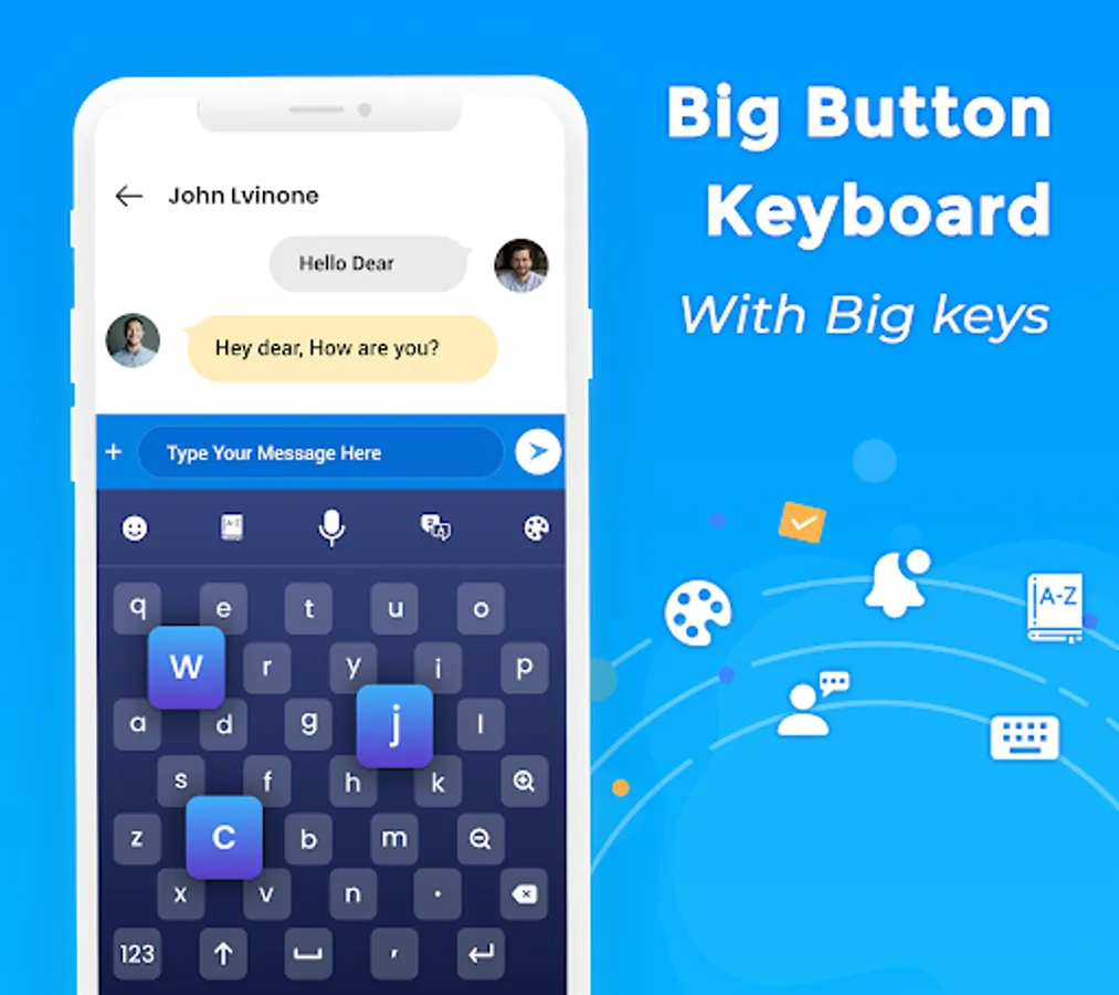 Big button typing keyboard will boost your social life by connecting you with everyone else. It contains a big keyboard besides that you can make your chat more catchy by adding emojis in it. The voice translator feature of the big button app will translate your native language to any other language for you.Big button keyboard contains customized themes from which you can apply any theme you want and enjoy typing text. Big button keyboard contains all the essential features for making your daily life much easier. Just enable the big keyboard and enjoy typing text. Big button keyboard contains multiple customized keyboard themes, so you can select your own keyboard theme.