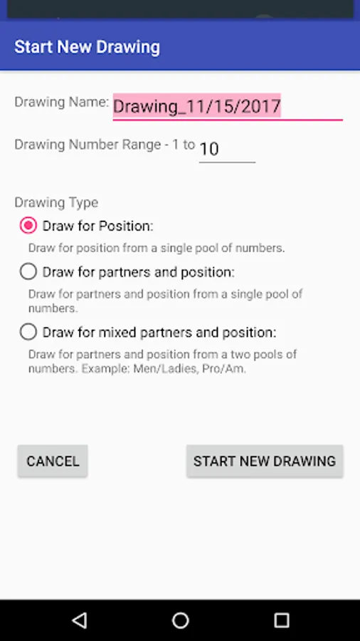 Drawing a number from a hat or basket is a common way to assign an order or pair up entrants for an event. RandomDraw allows using your phone to be used for that purpose along with providing some additional benefits such as assigning a name to that number and saving it for use later.