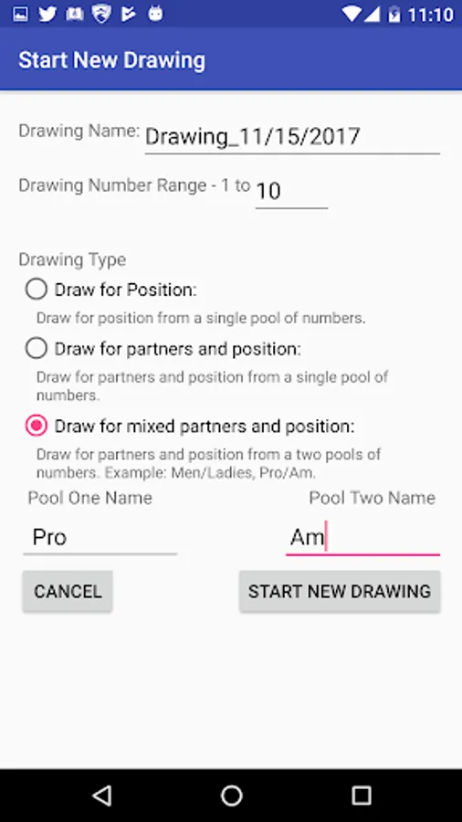 Draw for Mixed Partners and Position - Two separate pools are used for this option. The pools may be assigned names such as Men and Ladies or Pros and Ams. Each group draws from their own pool and paired with people from the other pool. This can be used to partner up mixed groups.
