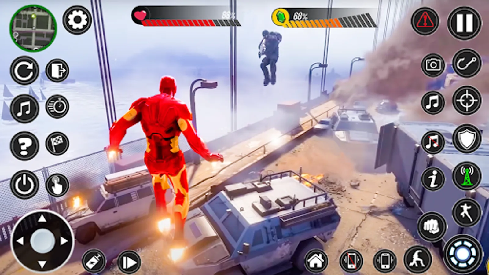 Amazing superpowers, like flying, jumping, muscular strength, and rope for extreme robot fight