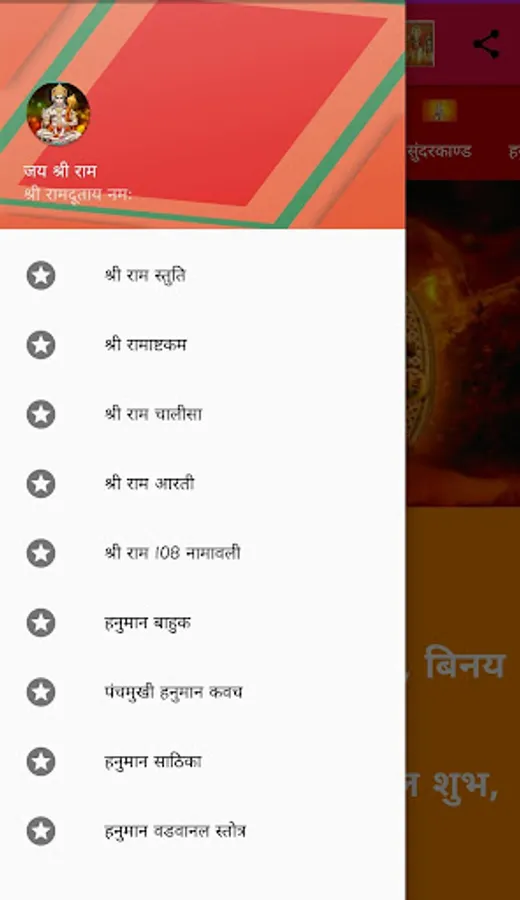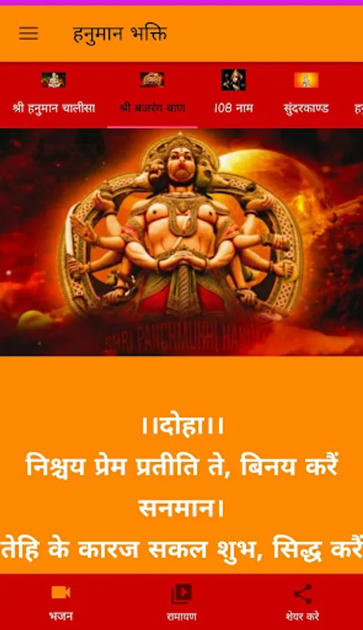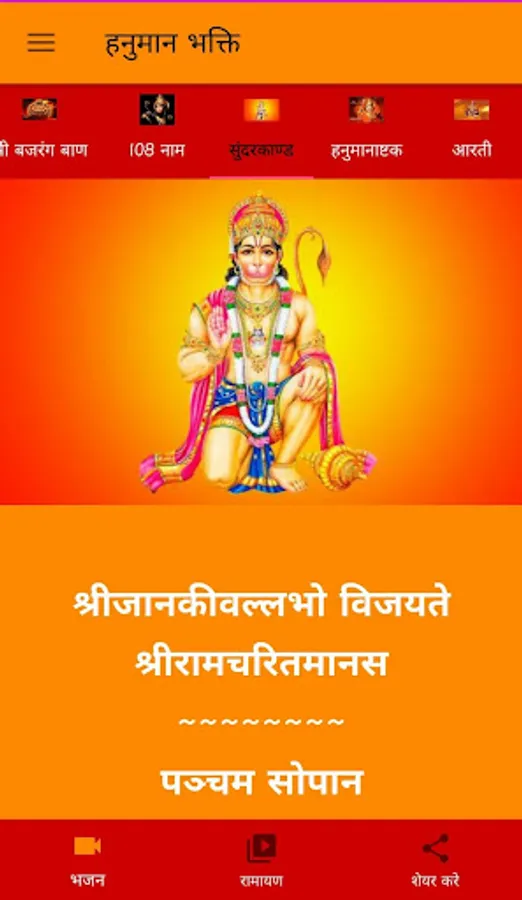 Hanuman Bhakti App offers you Hanuman Chalisa, Aarti, Bajrang Baan, Sundarkand, Hanumastak, one hundred eight names of Lord Hanuman, Ram Stuti, Ram Chalisha, Ram Aarti, Ramastak, Lord Raam of one hundred eight names, Hanuman Bahuk, Hanuman Kavach, Hanuman Badwanal Strotra, Hanuman Sathika, and video Bhajans You can use this in your daily life.