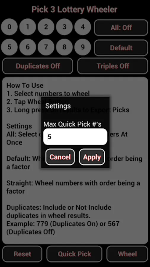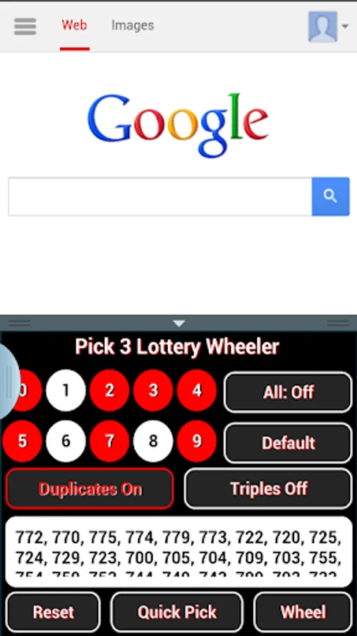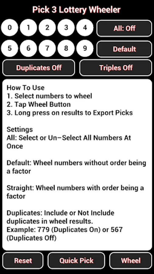 Use the Quick Pick feature to automatically have Pick 3 Lottery Wheeler generate number combinations for you.