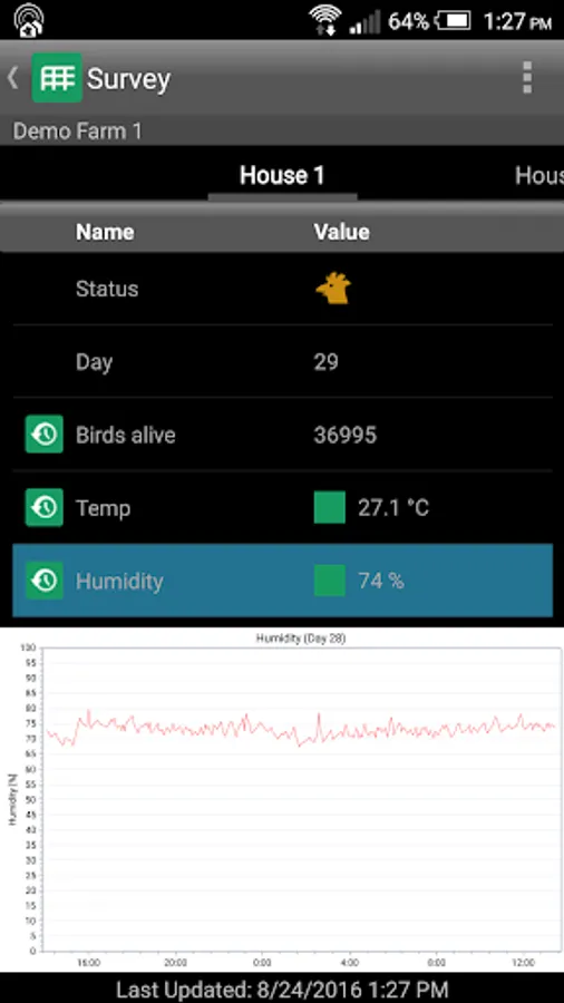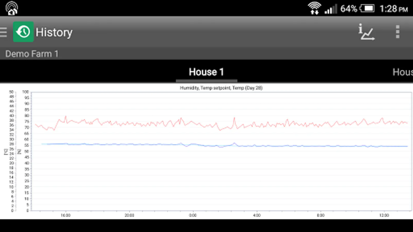 * The app allows for a free selection of the many different available values (e.g. temperature, humidity, set values or feed conversion). It is possible to retrieve the developing of several key figures, for an adjustable time period and to compare these as a curve or in a table.