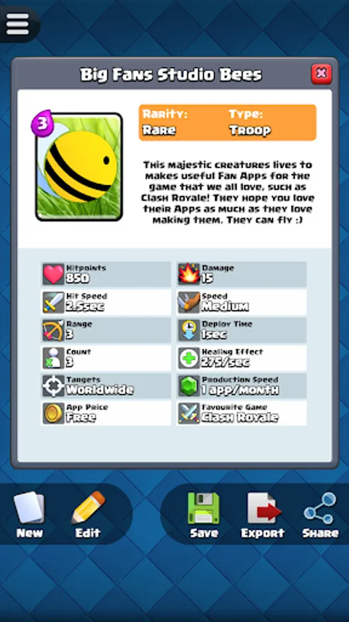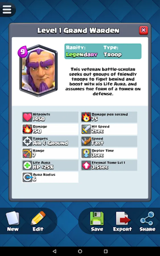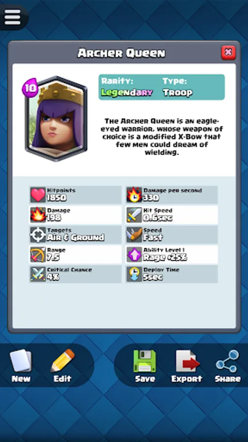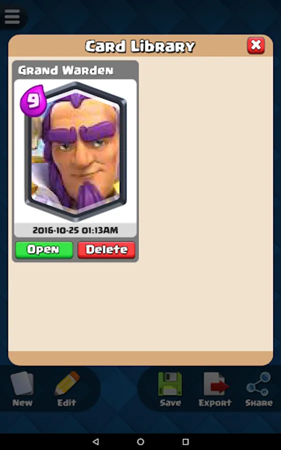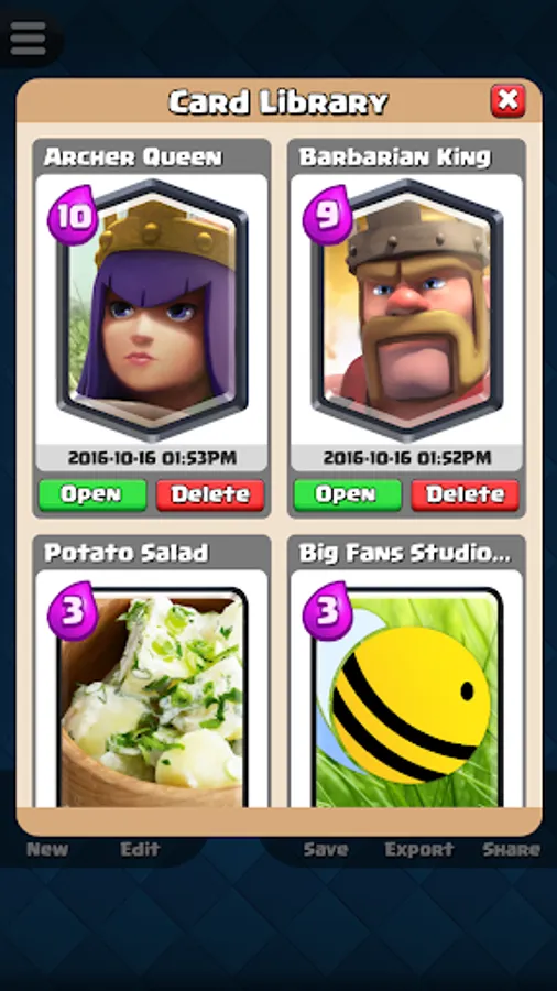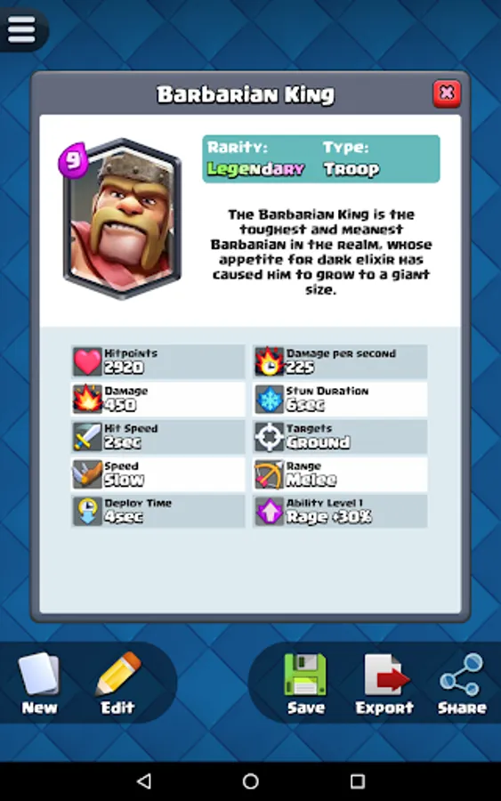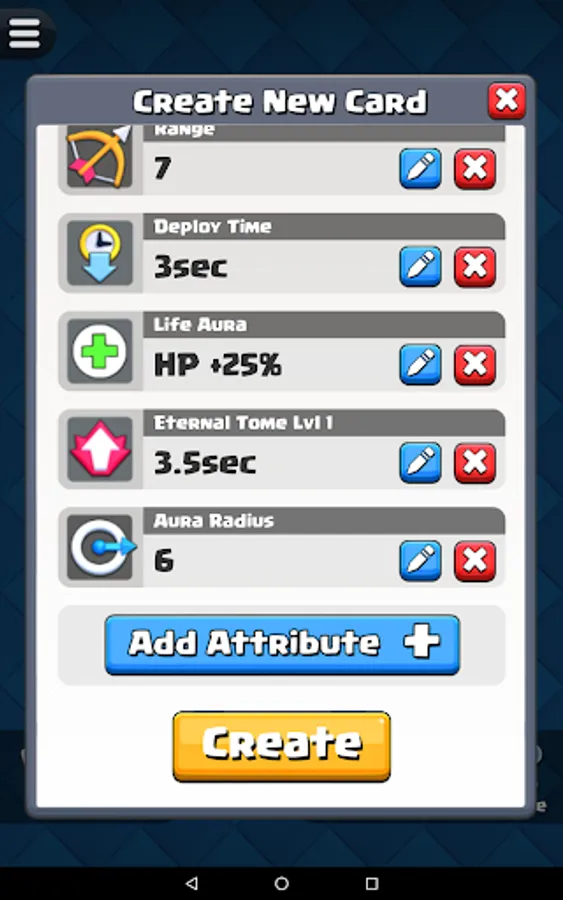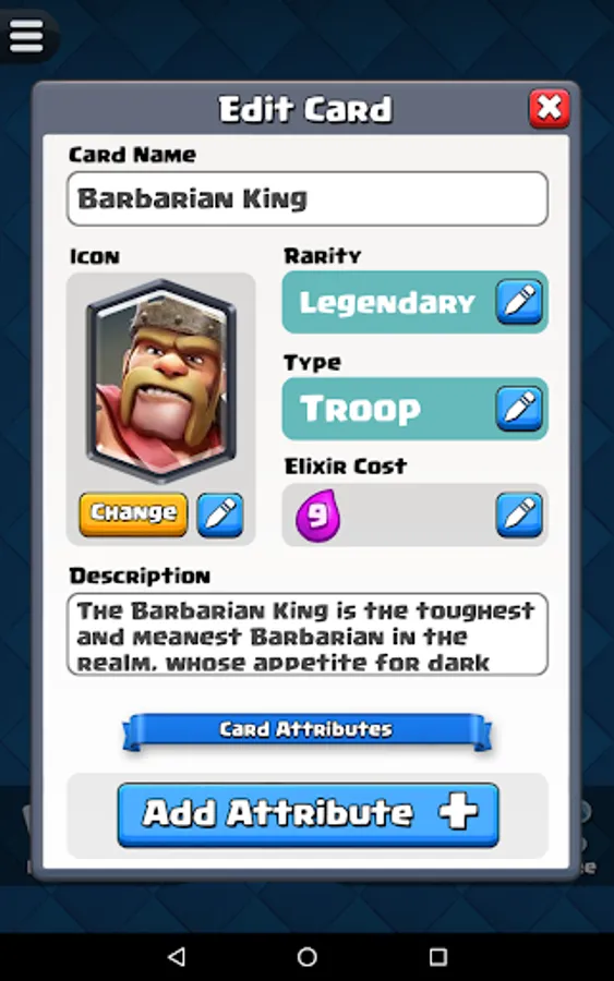 With this Card Creator, you can create your own Clash Royale card within a minute. The card created with this tool is looks as nice as the cards in Clash Royale game. It also allows you to create custom card attributes with a set of predefined attribute icons. You can also save your created cards in the built-in "Card Library" and open the card to review or edit at anytime. You can also export your cards as PNG image to save in sdcard or share it with you friends with just one click.