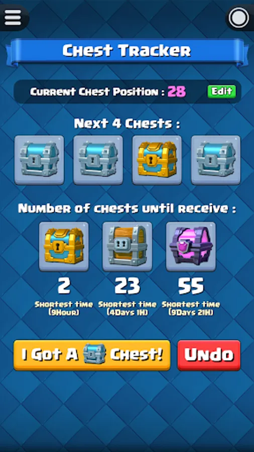 Everytime you received a chest from Clash Royale battles, open this app and click "I Got A Chest" button (Except Super Magical Chest, Epic Chest and Legendary Chest). This Chest Tracker will show you the next four chests and tell you how many more chests until the next Golden Chest, Giant Chest and Magical Chest.