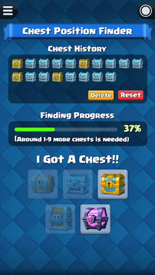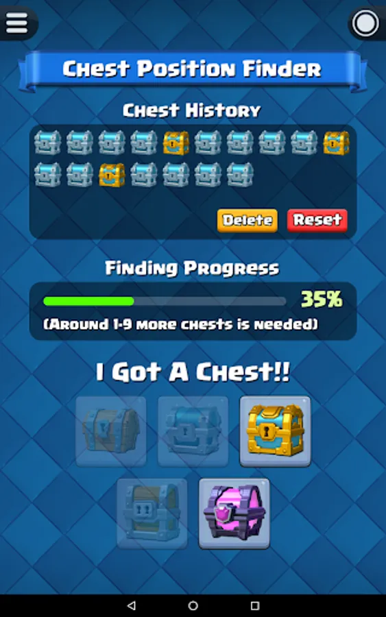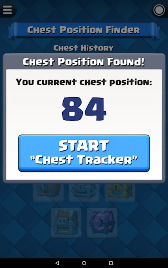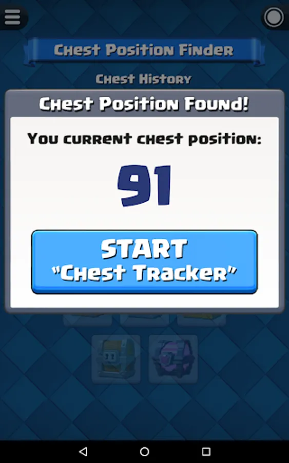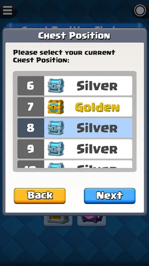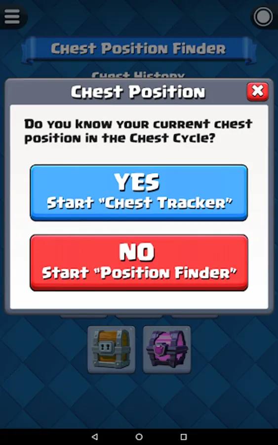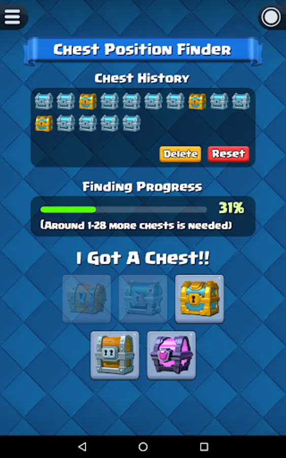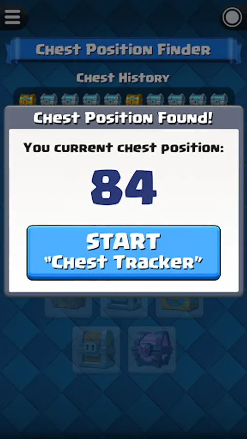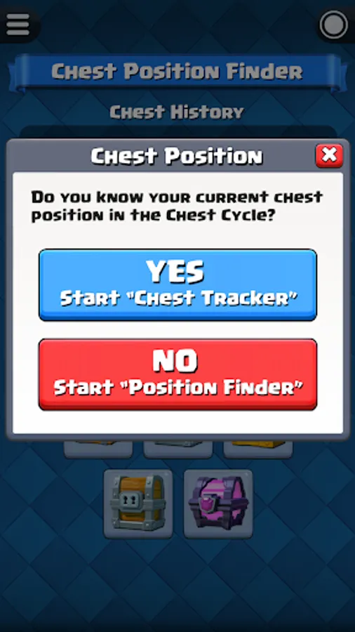 Before start the chest tracking, you have to know your current chest position in Clash Royale. For experience player that played Clash Royale for a long time, you probably already forgot how many chests you opened so far. Fortunately, this app have a built-in function "Chest Position Finder" that able to help you find out your current chest position.