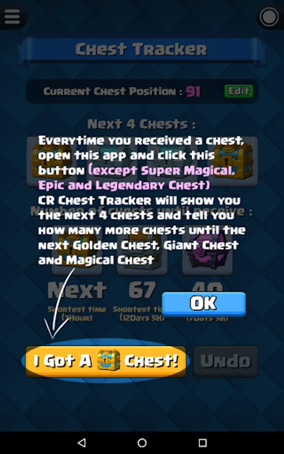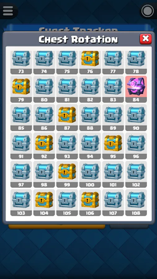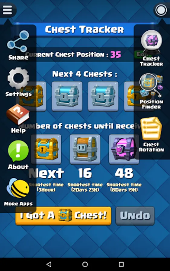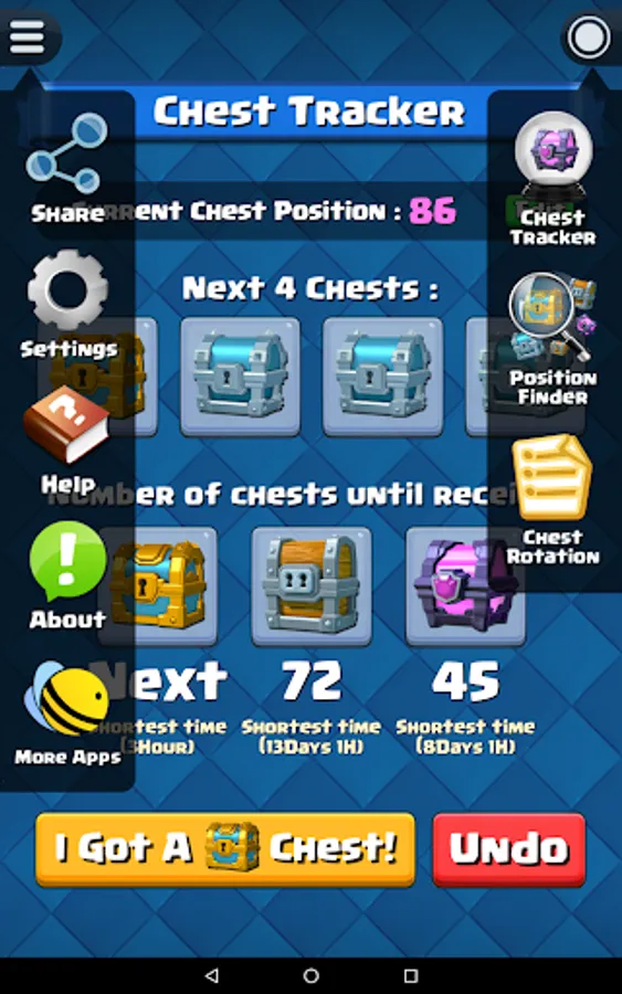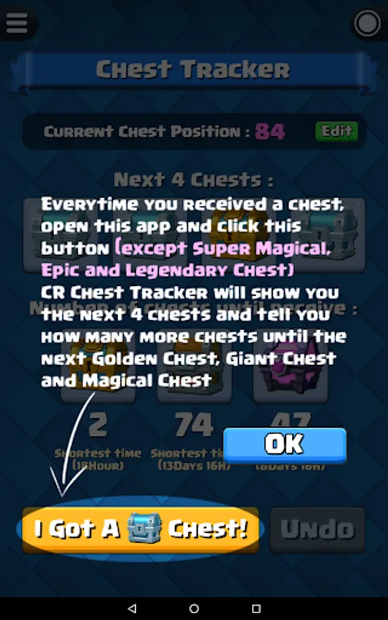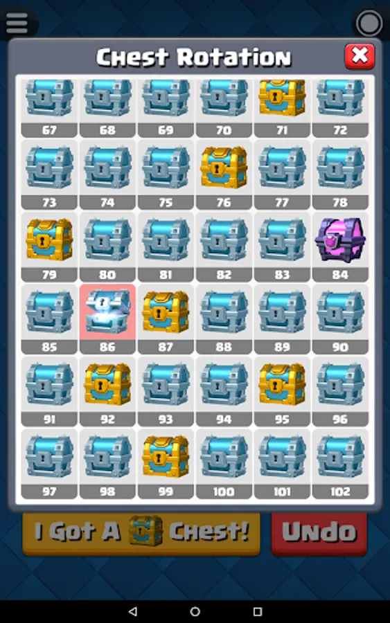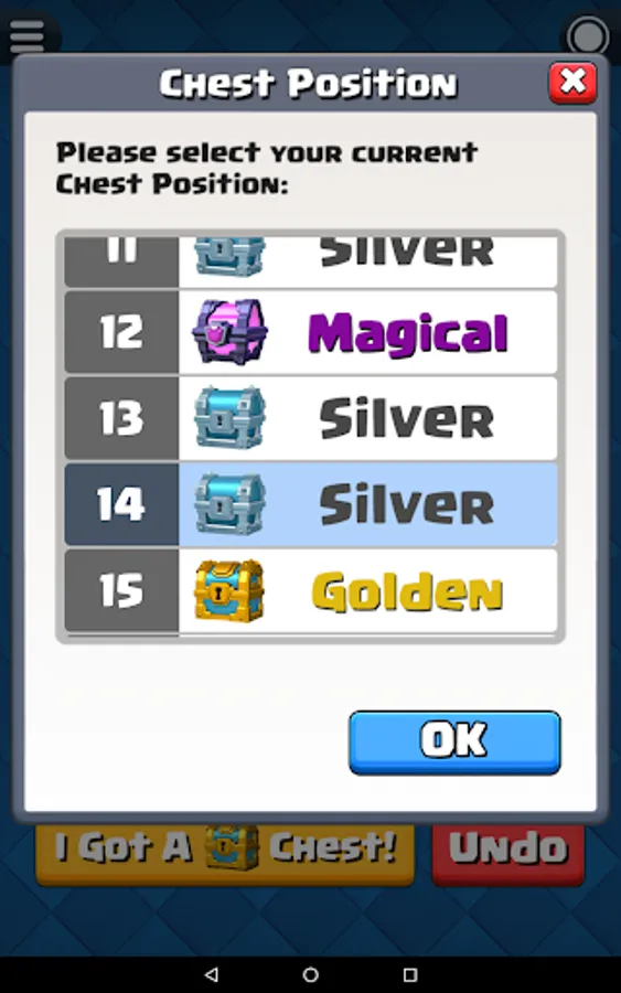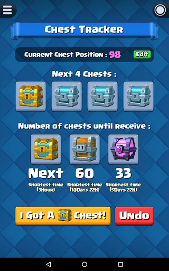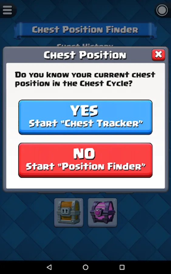 Before start the chest tracking, you have to know your current chest position in Clash Royale. For experience player that played Clash Royale for a long time, you probably already forgot how many chests you opened so far. Fortunately, this app have a built-in function "Chest Position Finder" that able to help you find out your current chest position.