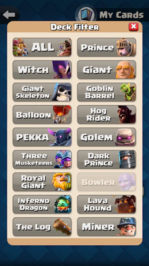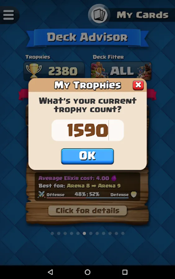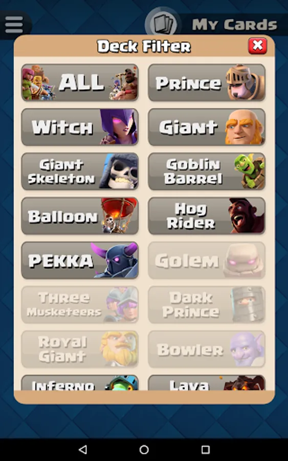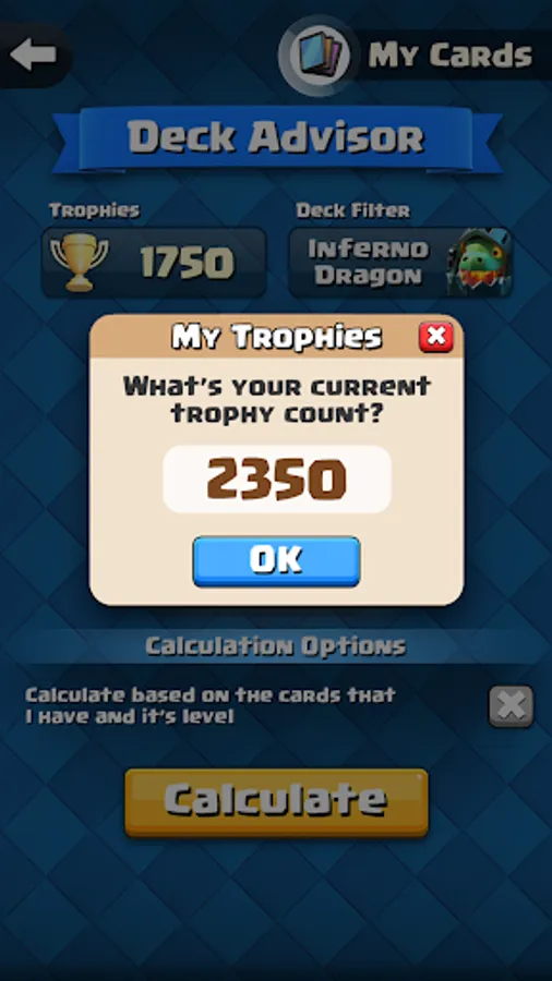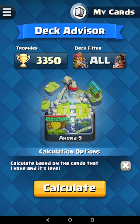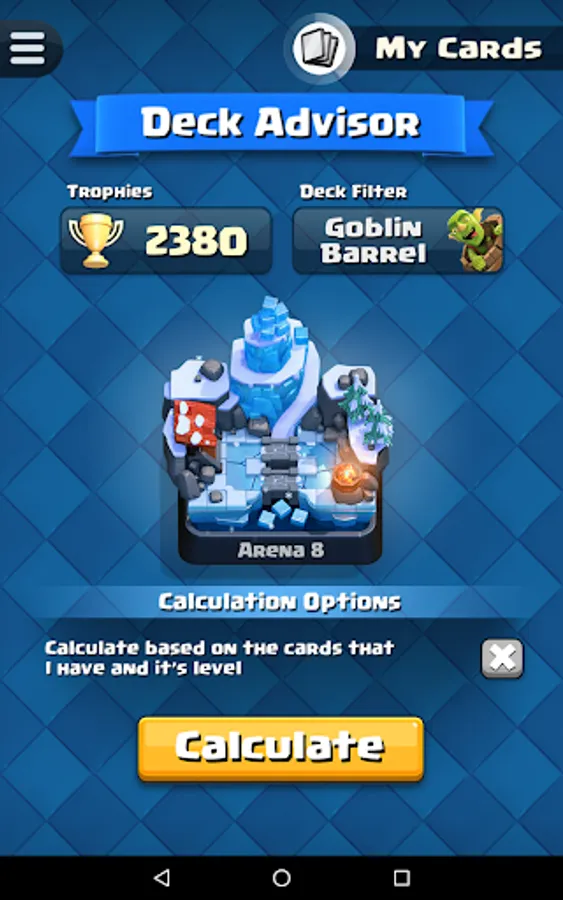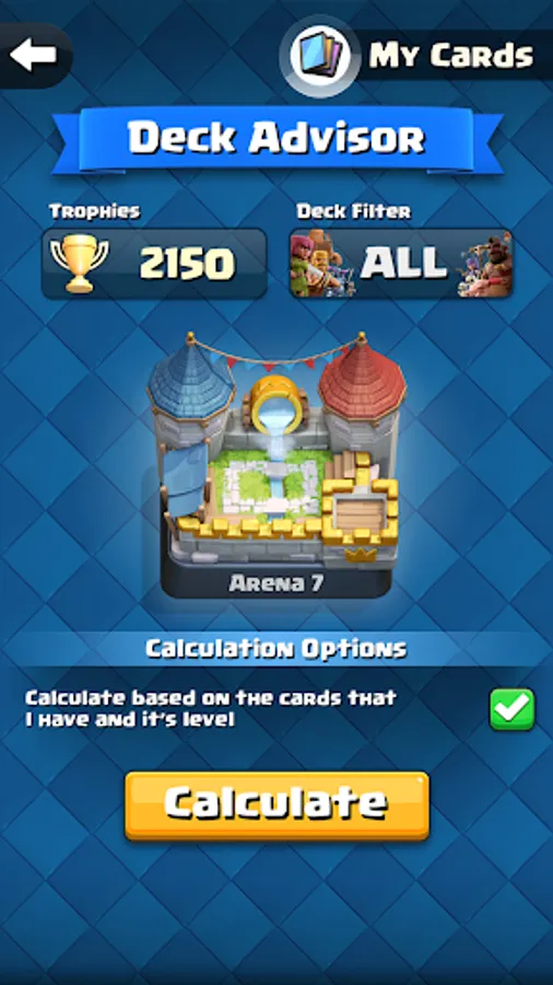 - Enable counter deck calculation based on the cards that you have and it's level in Clash Royale