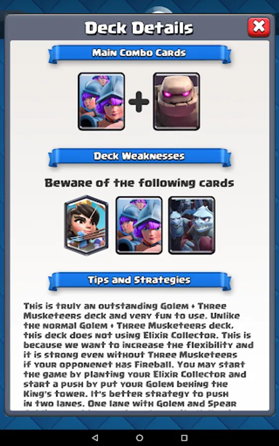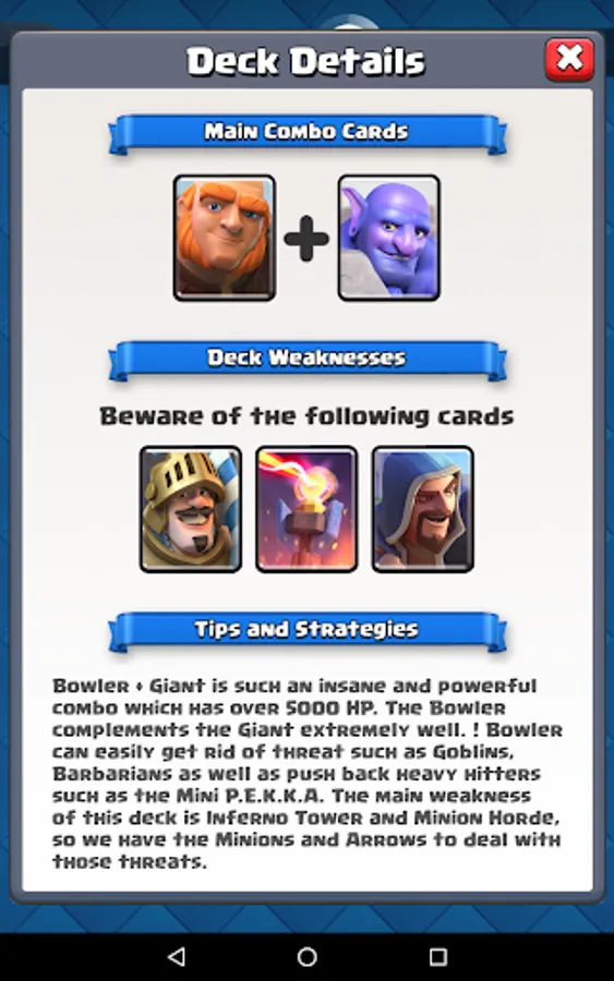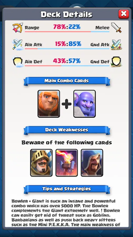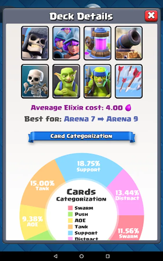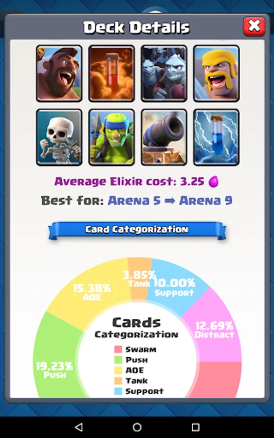 Deck Advisor contains around 85 decks from different Arenas. We can't says that it is a lot, but all the decks have been tested and each recommended deck will comes with "Performance Analysis" and "Tips & Strategies".