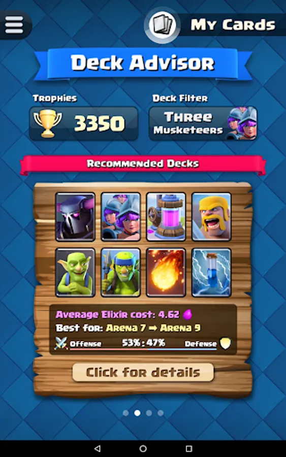 Deck Advisor (fan app for Clash Royale) is a helper tool that provides recommendation of high win rate battle deck based on your current trophy count, your card collection and card's level in Clash Royale.