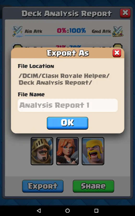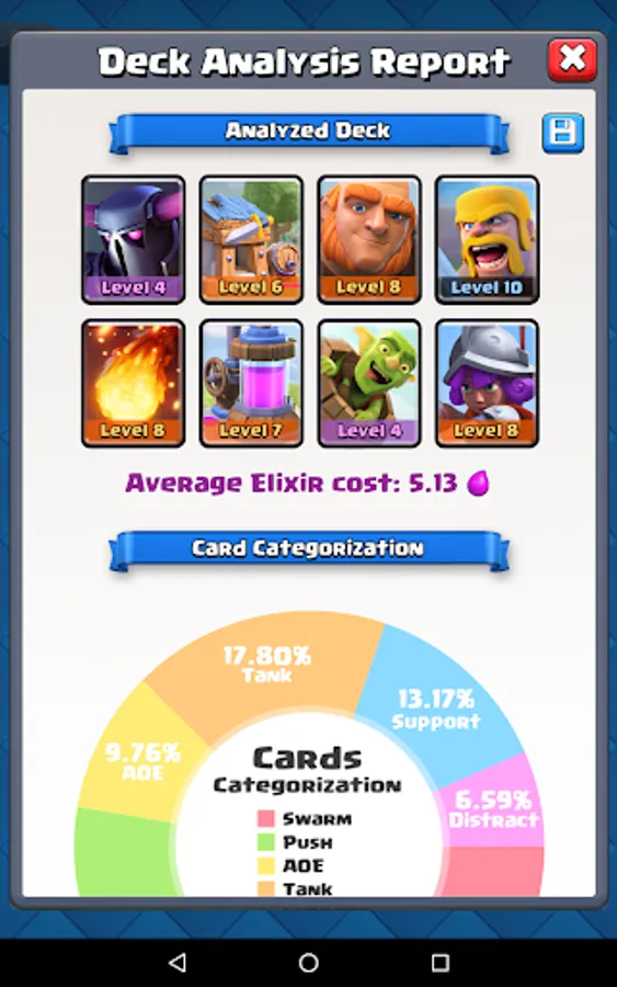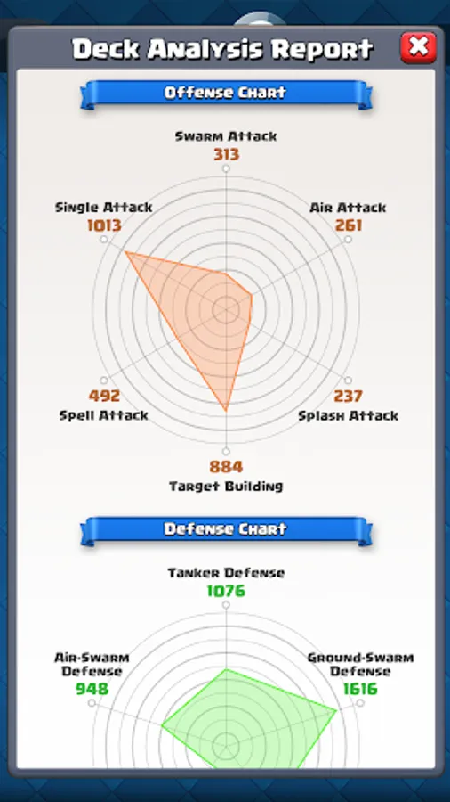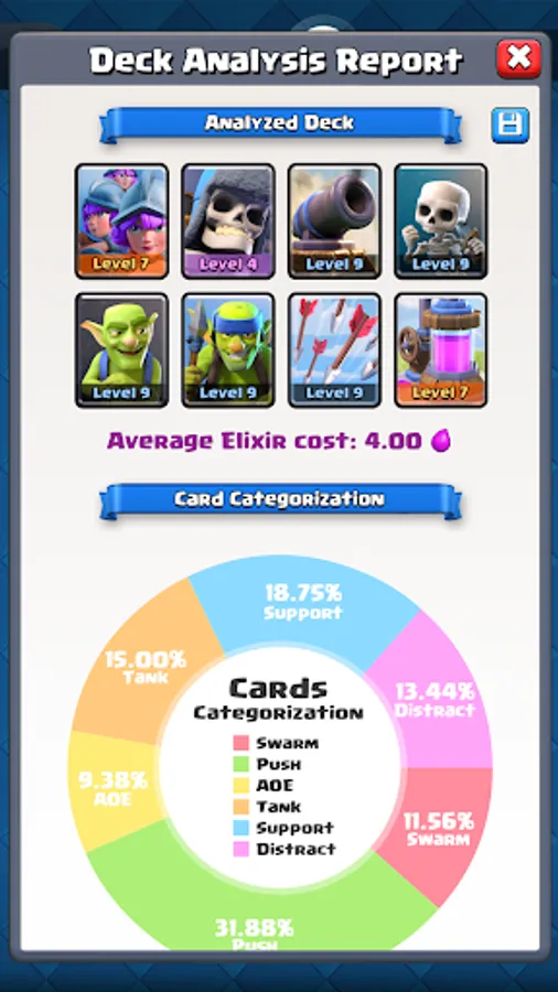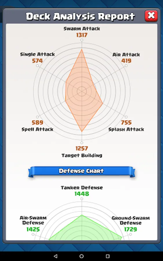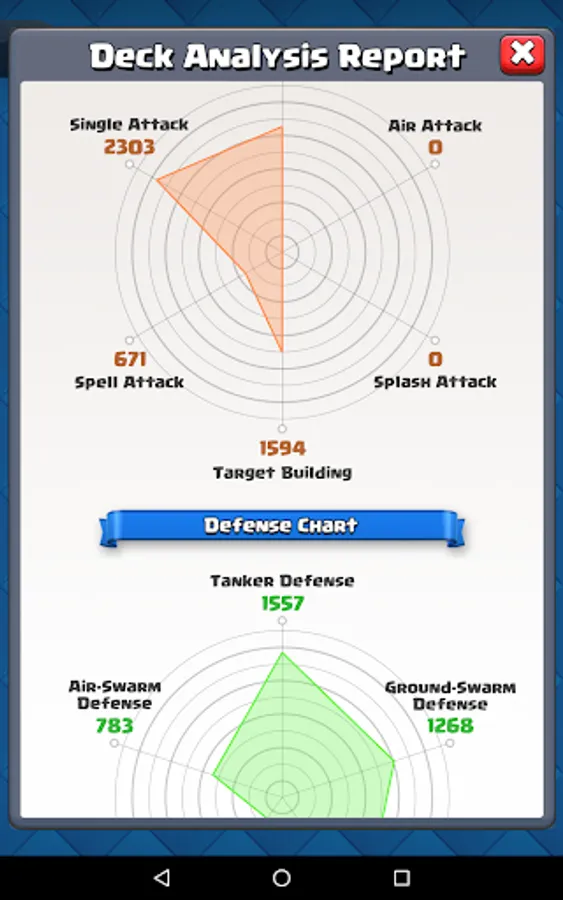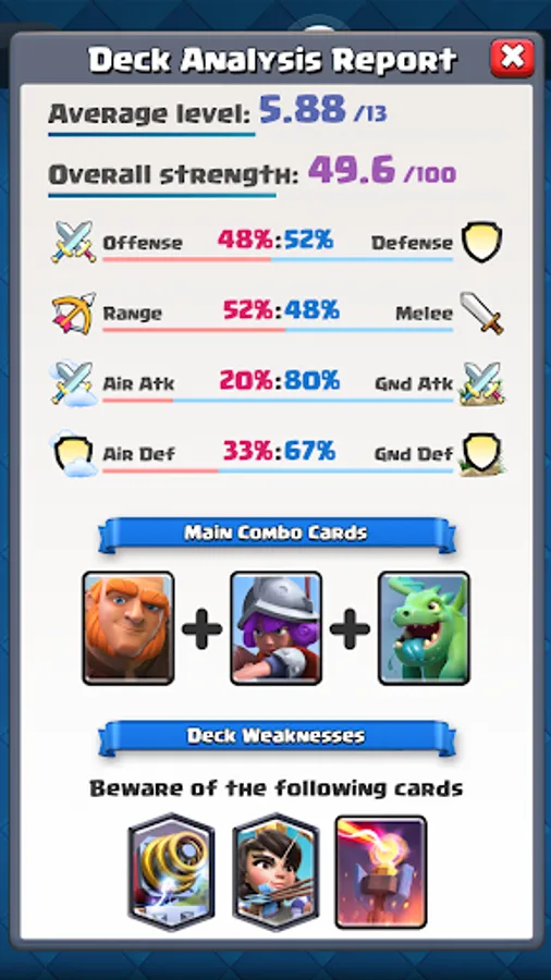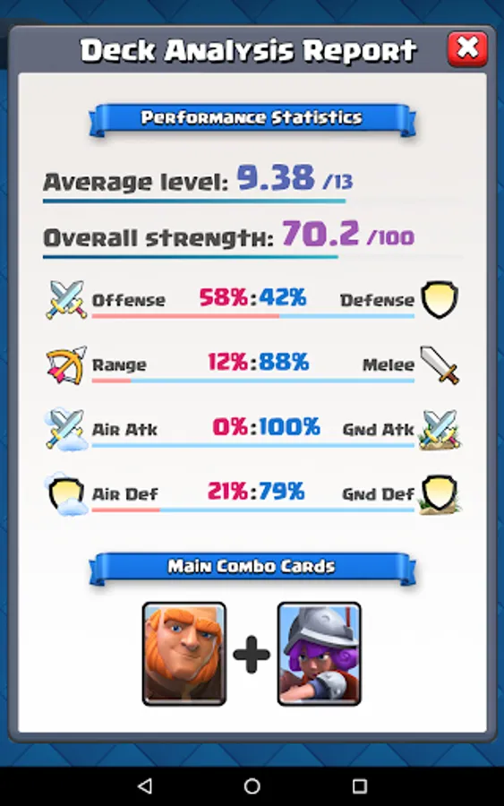 As we know, building a well balanced Clash Royale battle deck is always the key for success in Clash Royale. Deck Analyzer analyze every battle deck in detail and provide you with all the most important information to create a well balanced and powerful battle deck. Deck Analyzer also save you a lot of time from trial and error and blind attempts when building new battle decks in Clash Royale.