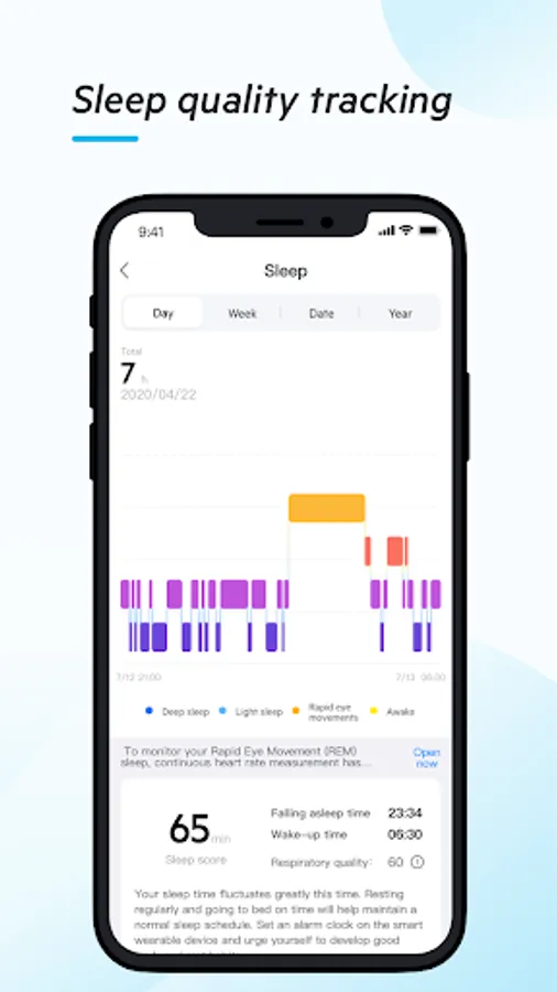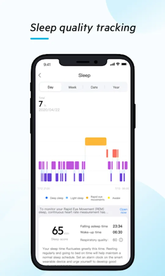 [Record Sleep]: Record your sleep data, including sleep duration, deep sleep, light sleep and rapid eye movements (REM), in order to monitor and improve your sleep quality;