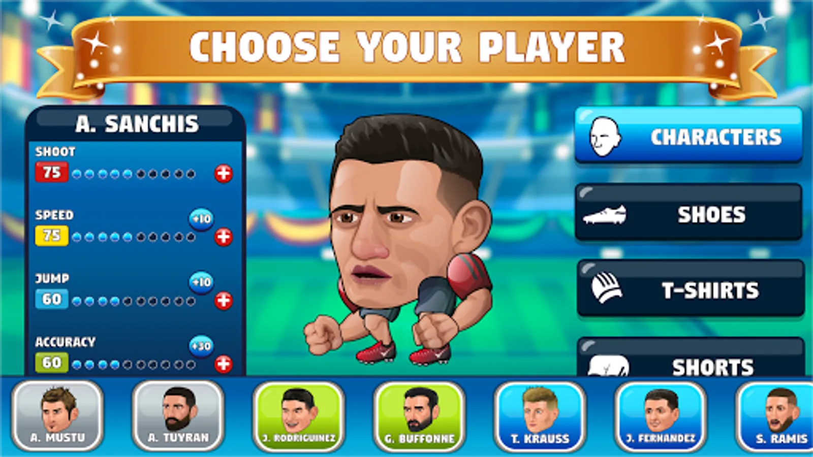 Enjoy soccer as famous player, get rewards, improve your character's abilities, customize your equipment and defeat your opponent until you become the ruler of the Big Head Soccer League.