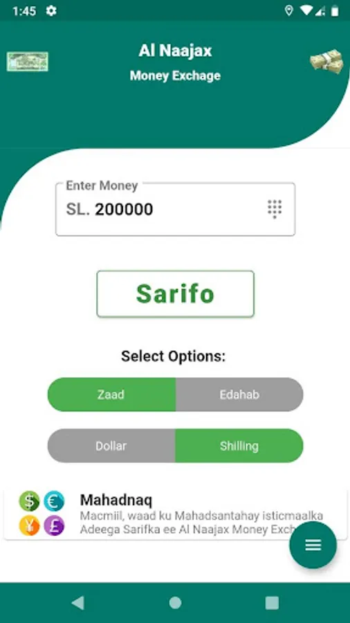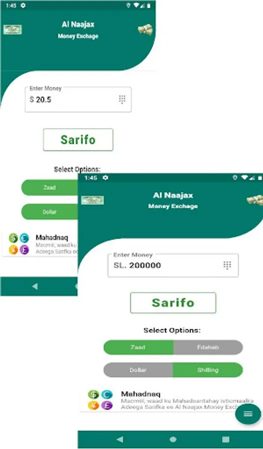 Al Najaax Money Exchange simplifies the exchange of money between Dollar and Somaliland Shilling accounts. Works with Zaad and eDahab. Supports single and dual SIMS.