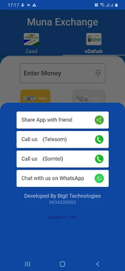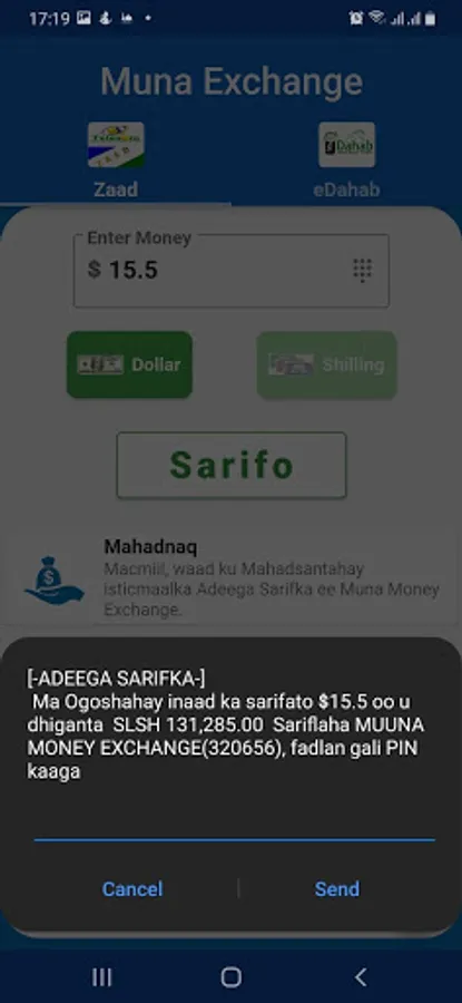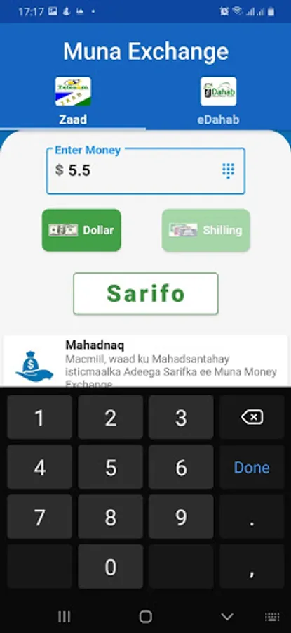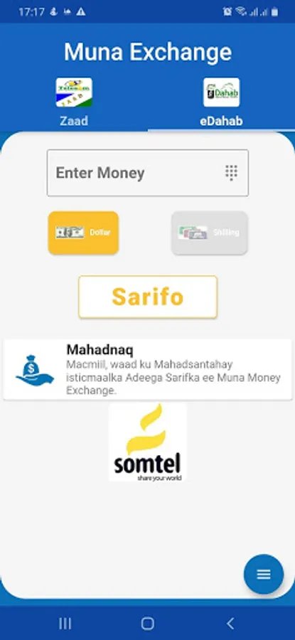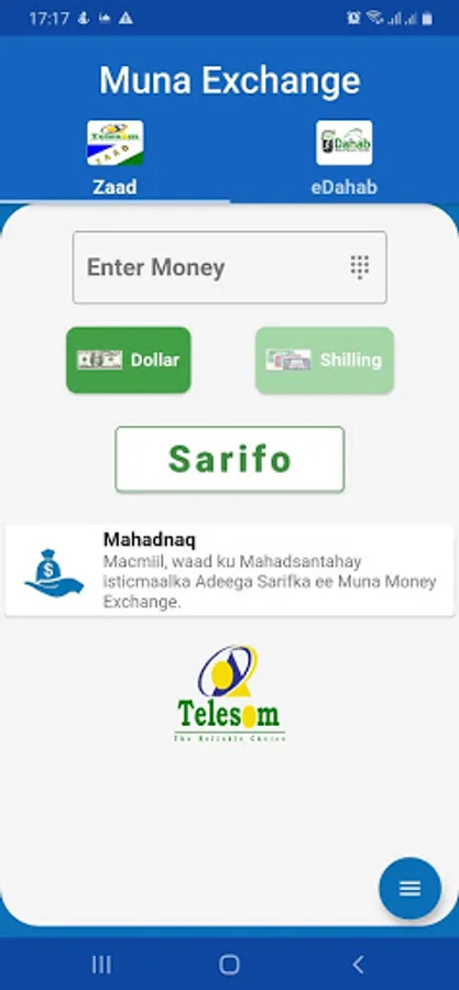 Muna Money Exchange simplifies the exchange of money between Dollar and Somaliland Shilling accounts. Works with Zaad and eDahab. Supports single and dual SIMS.