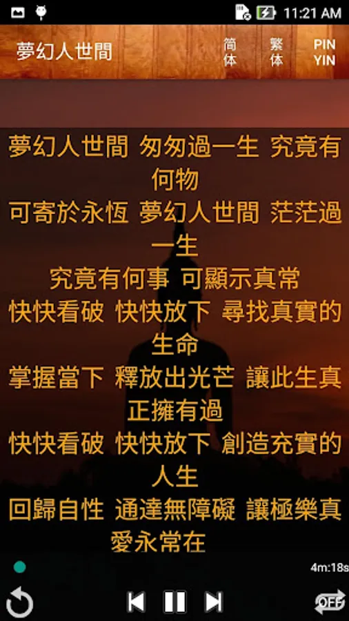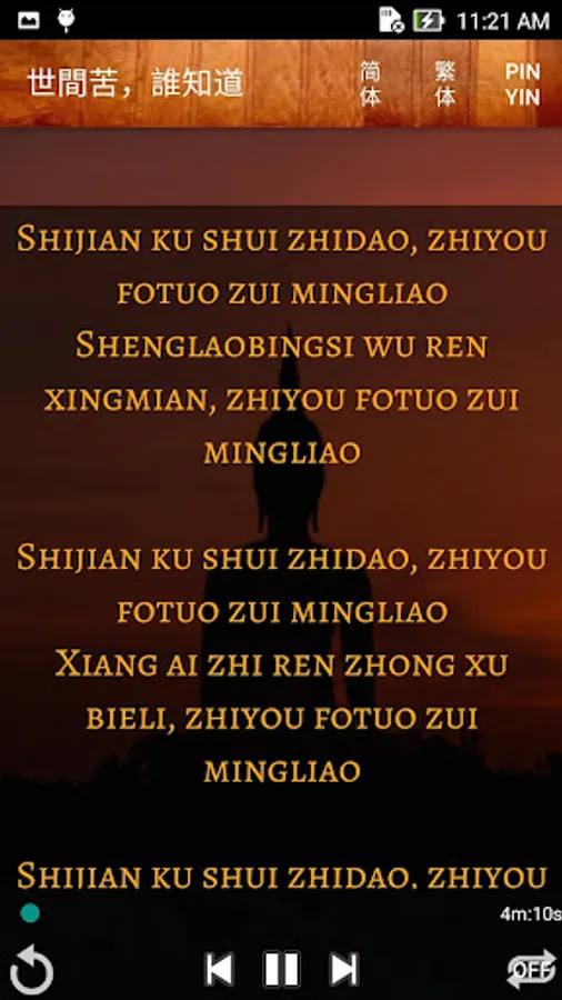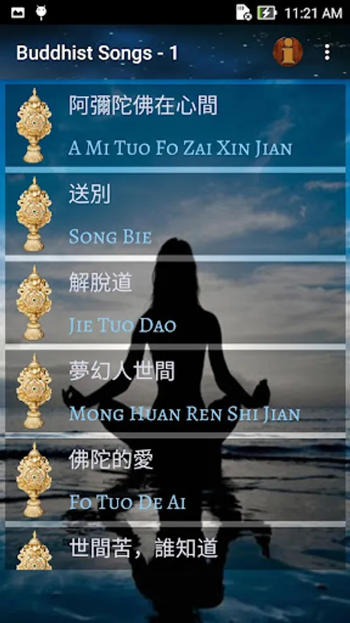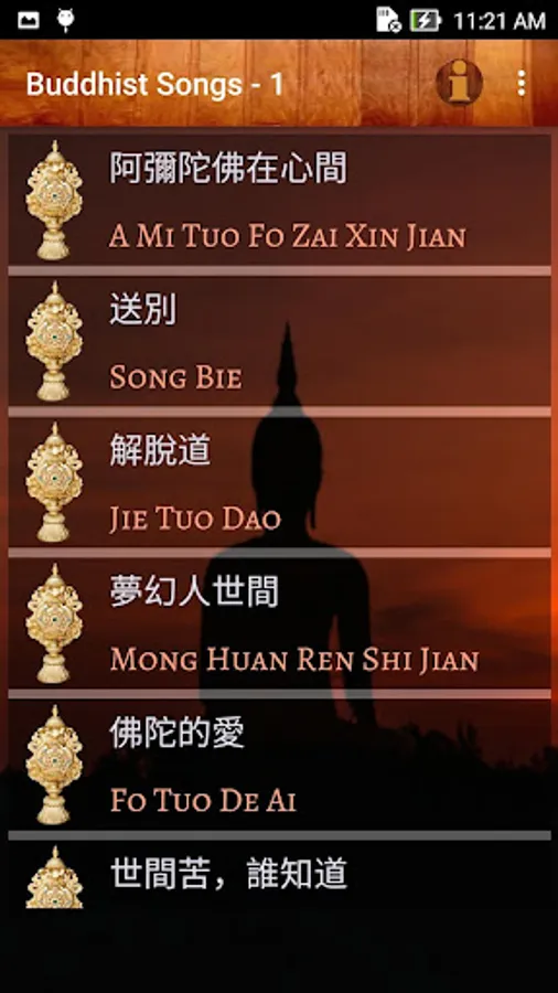 Because we have affinity with Buddhism, so I decided to create free of charge Buddhist song apps. Faithful followers of Buddha can hear the sweet music at any time anywhere. This application contains the following six beautiful Buddhist songs: