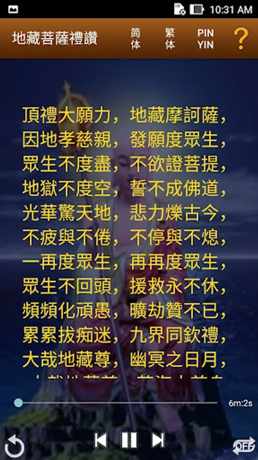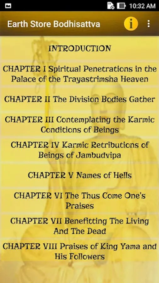 This app includes all chapters of the Past Vows of the Sutra of the Earth store Bodhisattva and also its mantra chanting. Its mantra include:-