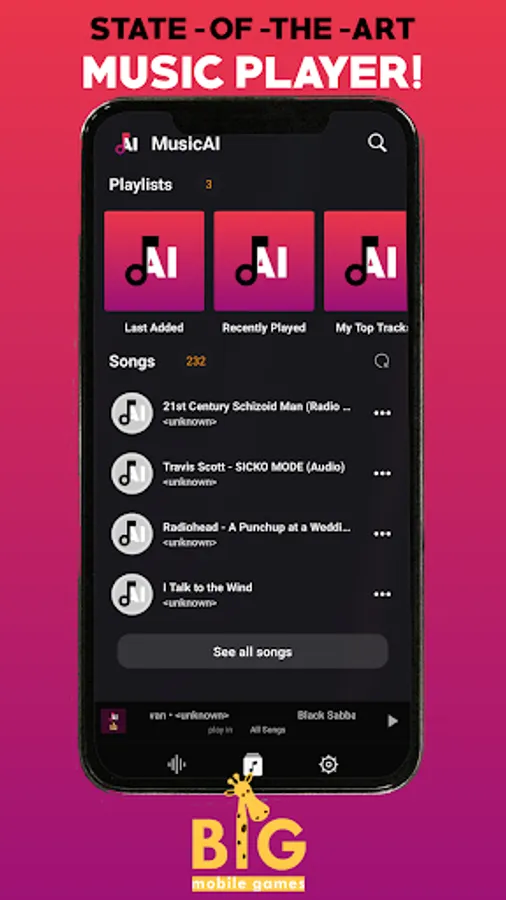 MusicAI (Music AI) - AI Music Generator is developed by Big Mobile Games. We hope you find this application useful. If you have any suggestions, please feel free to contact us. Thanks.