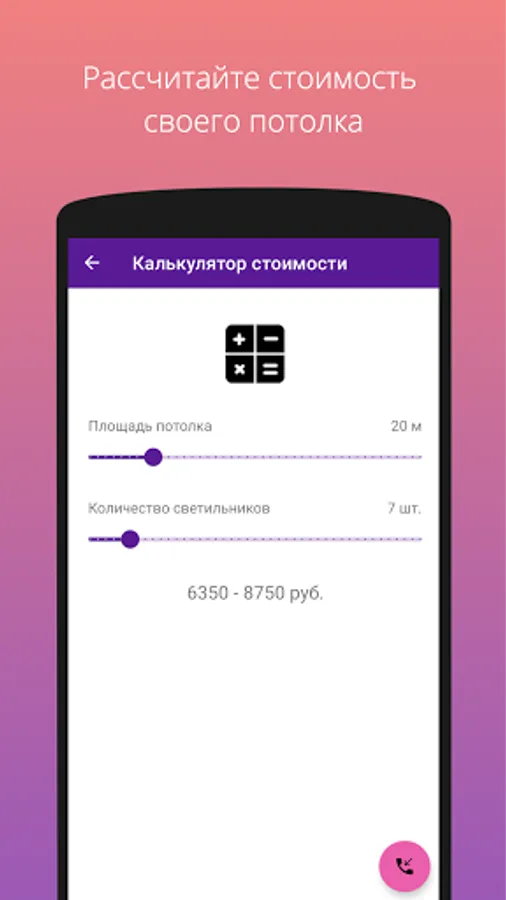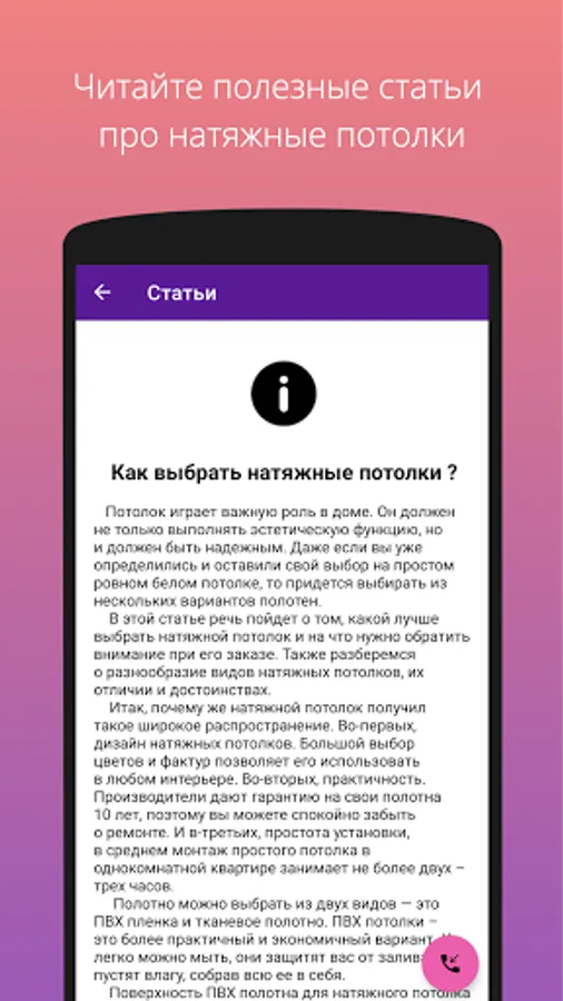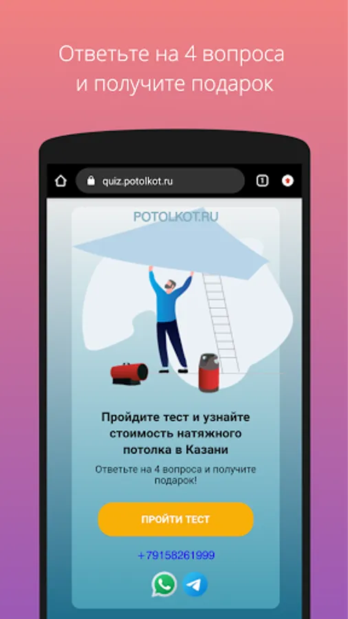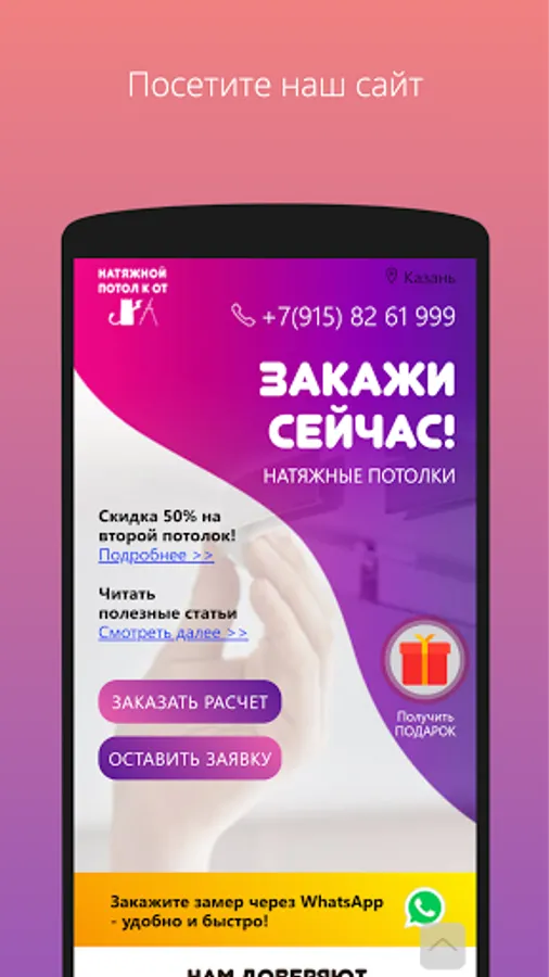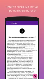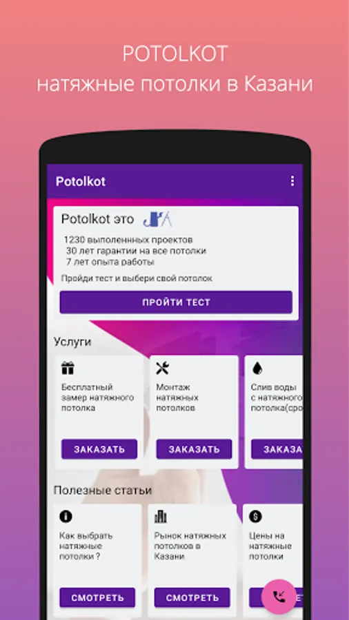 Potolkot is a handy application about stretch ceilings, where you can read useful articles, calculate the approximate cost of a stretch ceiling, pass an easy test and receive a gift, as well as order free measurement of a stretch ceiling in Kazan