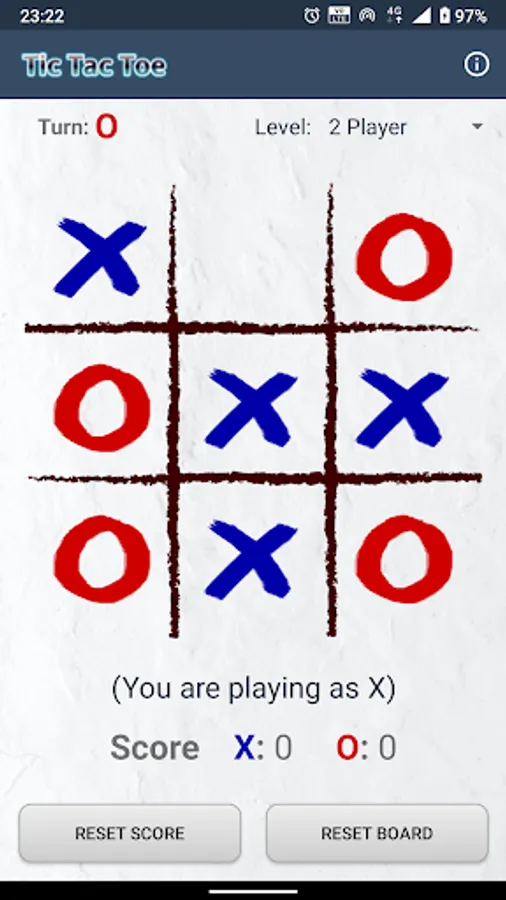 Tic-tac-toe (American English), noughts and crosses (British English), or Xs and Os is a paper-and-pencil game for two players, X and O, who take turns marking the spaces in a 3×3 grid. The player who succeeds in placing three of their marks in a horizontal, vertical, or diagonal row is the winner.